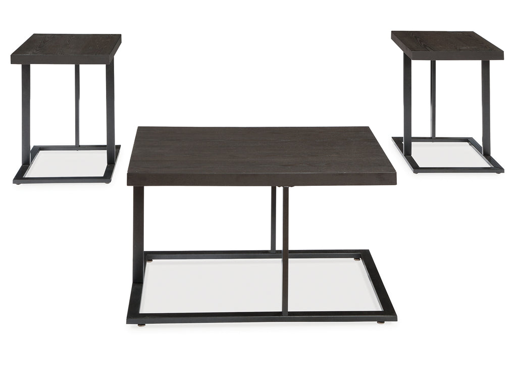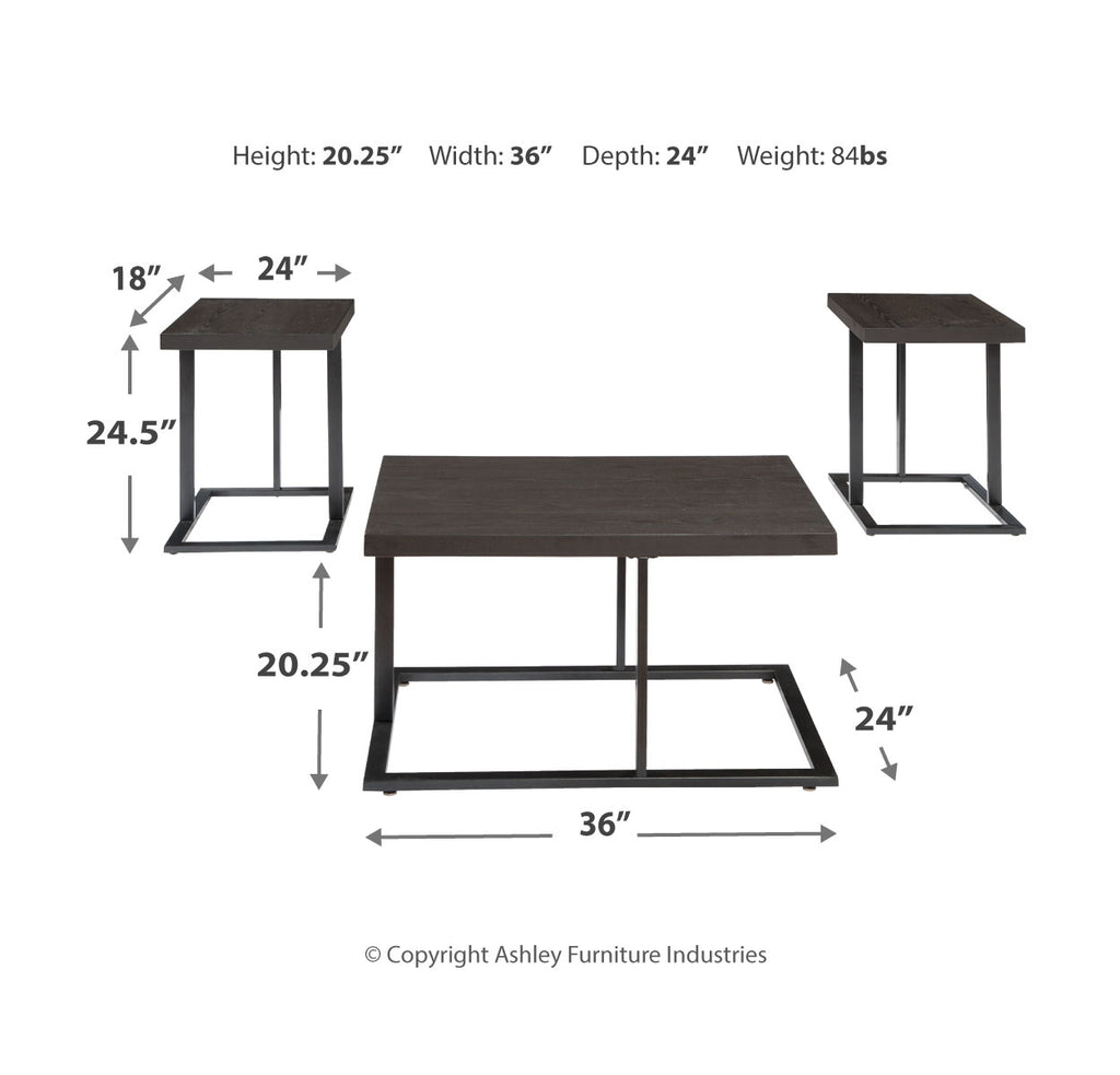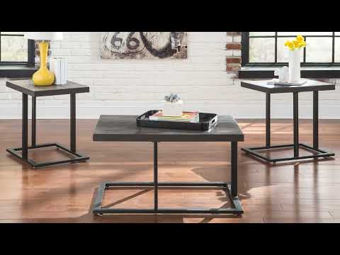 Style gone askew. This coffee table set goes off center in a beautiful way with an eye-catching cantilevered design. Sleek metal base in an aged bronze tone is a seamless merge with wire-brushed veneer tabletop with an earthy element. | Product Features