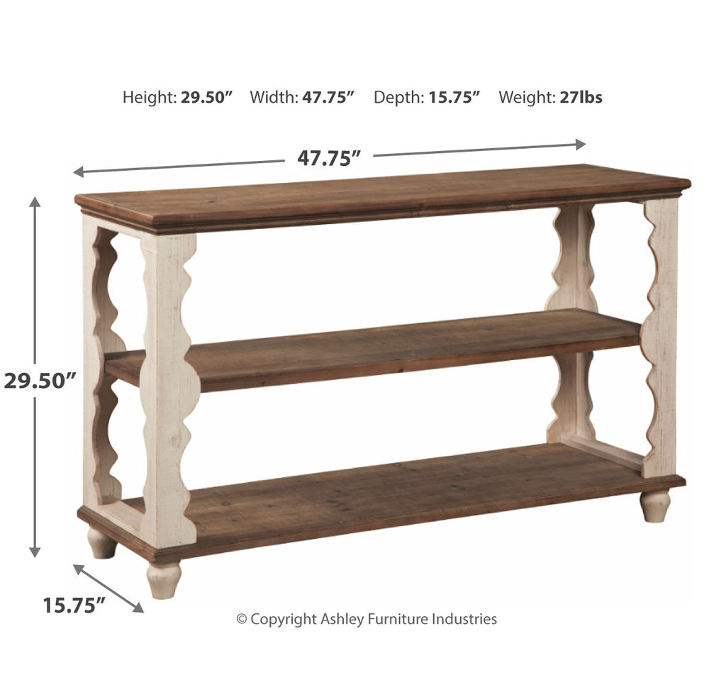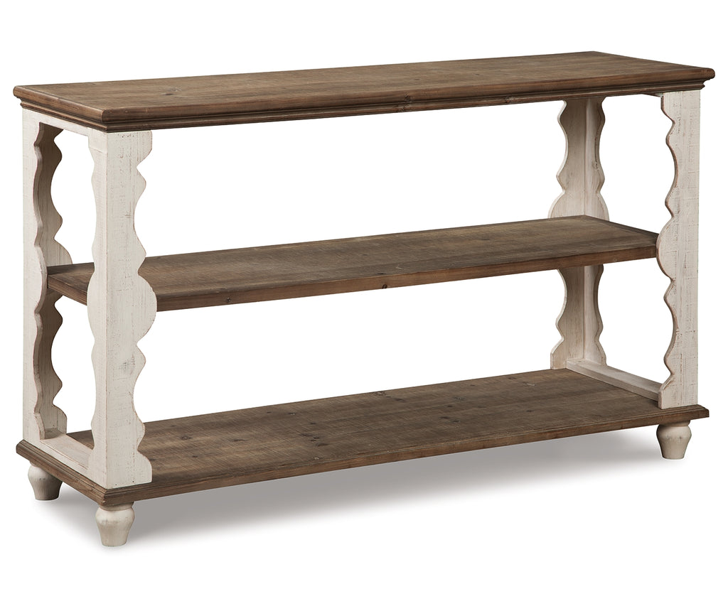 Simply put, this console sofa table is minimalism with maximum charm. Naturally finished knotty wood combined with antiqued white is an artful combination. But what really makes this console sofa table so spectacular: scalloped woodwork you just don’t see every day. | Product Features