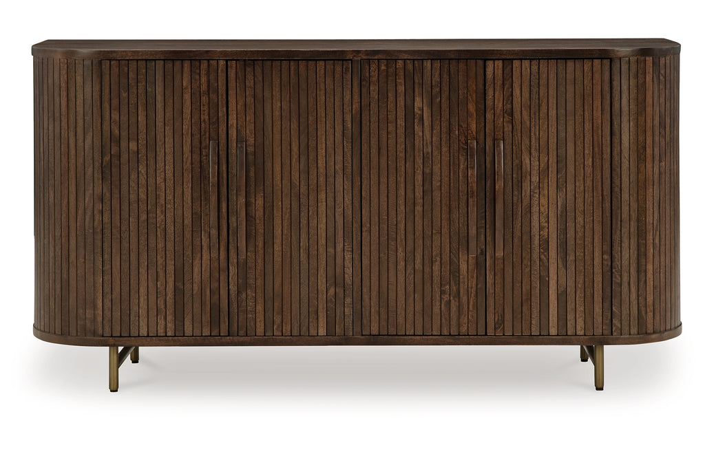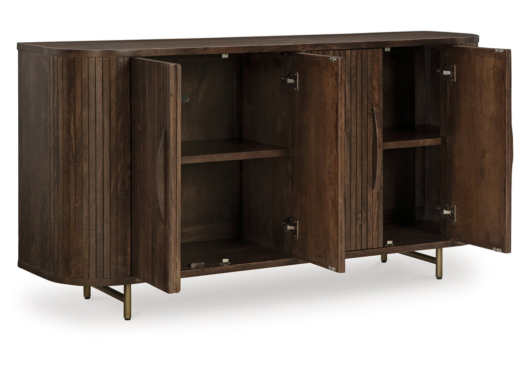 Function and style merge perfectly with this accent cabinet. Exquisitely crafted with mango wood, it makes a great case for refined contemporary design. Adding to its allure, the fluted door fronts and gracefully curved side detail keep the look cool with a mid-century vibe. The doors open to reveal interior shelves, ideal for hiding clutter or whatever you choose in fine fashion. | Product Features