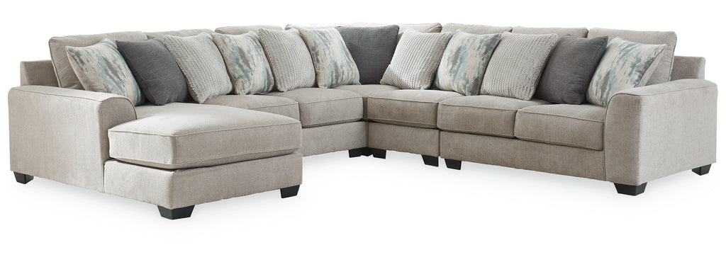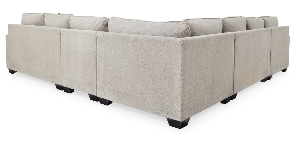 - Includes 5 pieces: left-arm facing corner chaise, armless loveseat, armless chair and right-arm facing loveseat and wedge