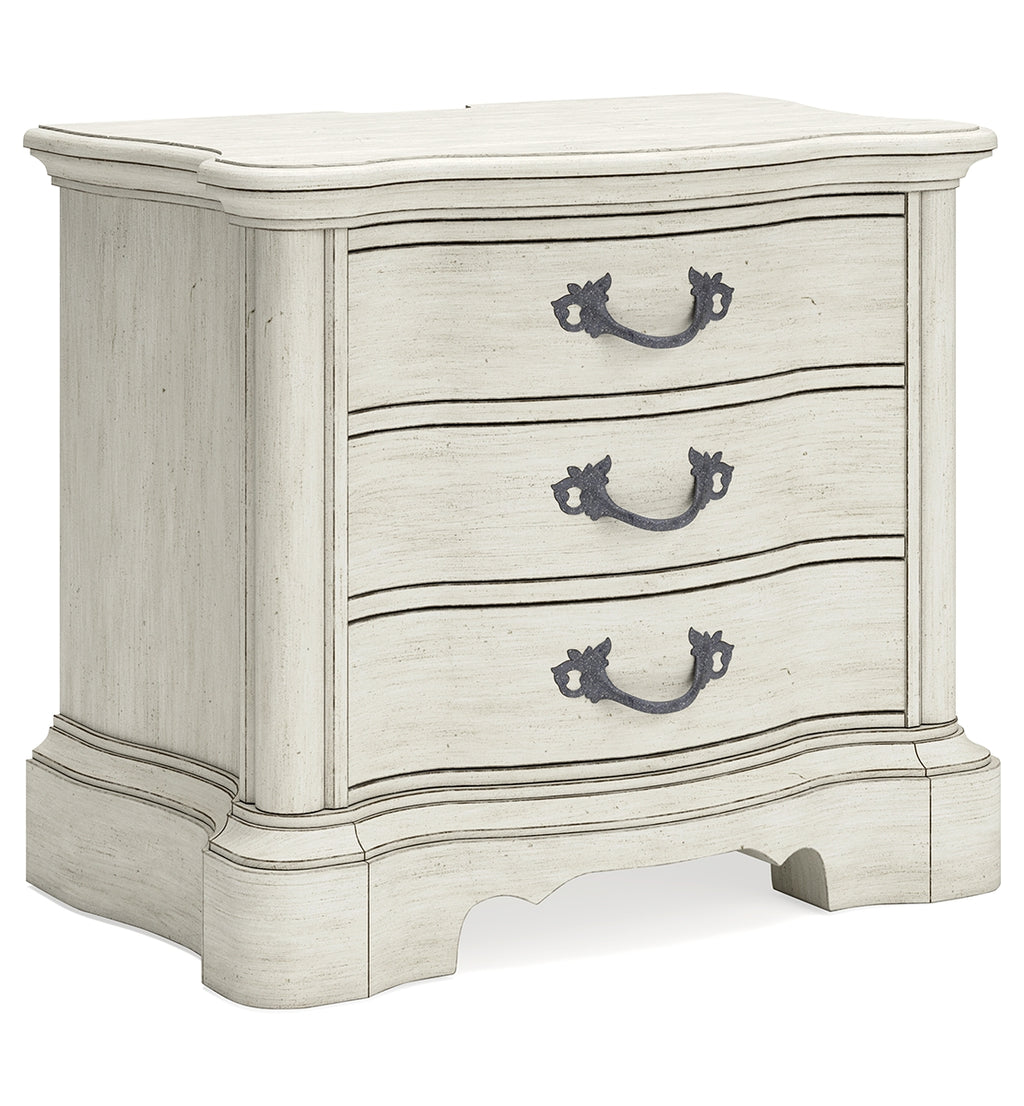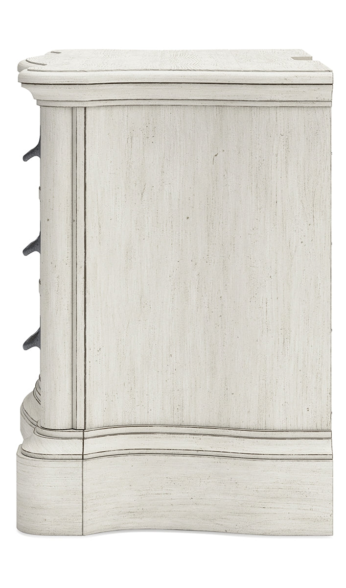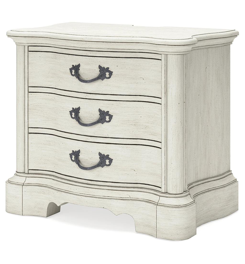 Add a touch of romance to your bedroom with this nightstand. Its antiqued white painted finish and serpentine-shaped silhouette are the definition of easy elegance. The nightstand's three spacious drawers accommodate bedside essentials, while an integrated power outlet and USB charging keep up with your high-tech lifestyle. | Product Features