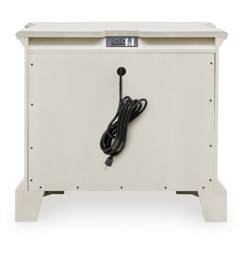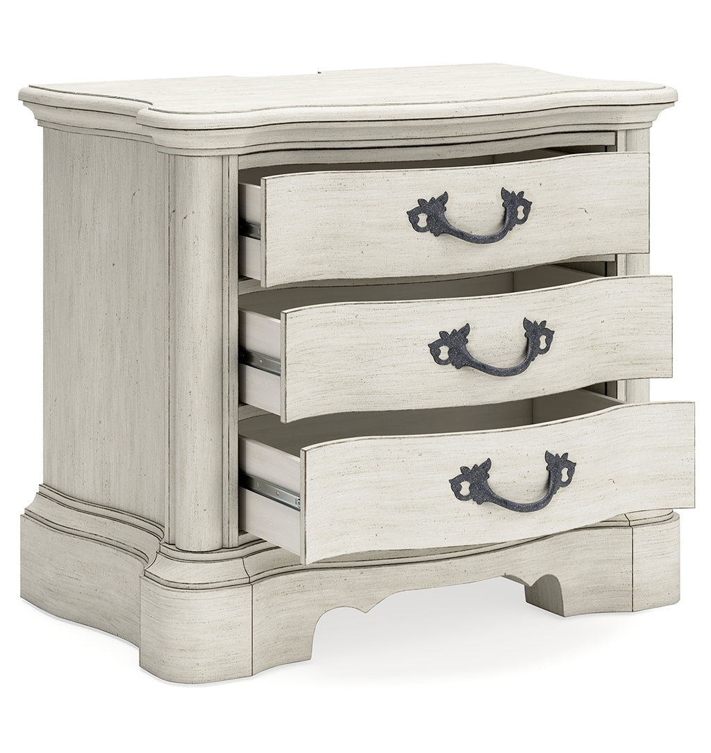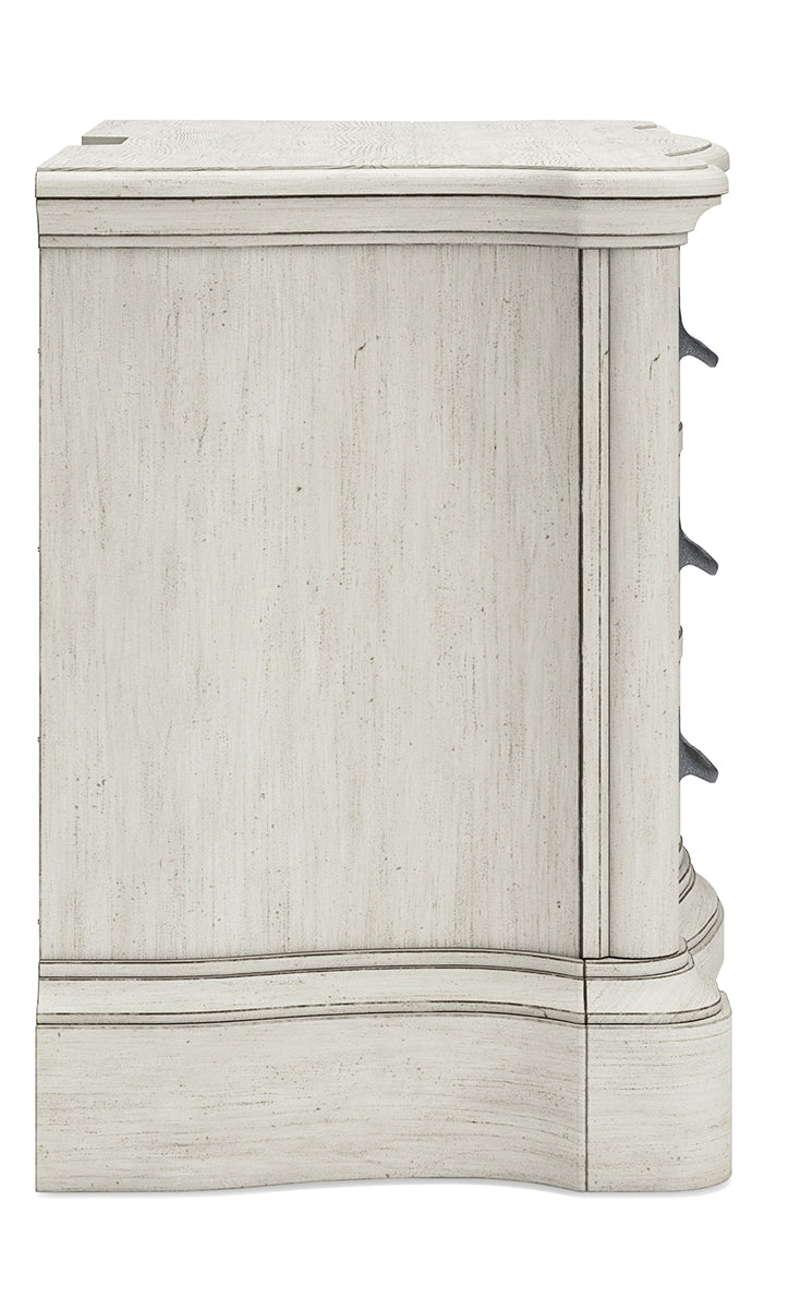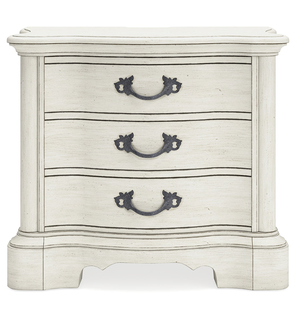 Add a touch of romance to your bedroom with this nightstand. Its antiqued white painted finish and serpentine-shaped silhouette are the definition of easy elegance. The nightstand's three spacious drawers accommodate bedside essentials, while an integrated power outlet and USB charging keep up with your high-tech lifestyle. | Product Features