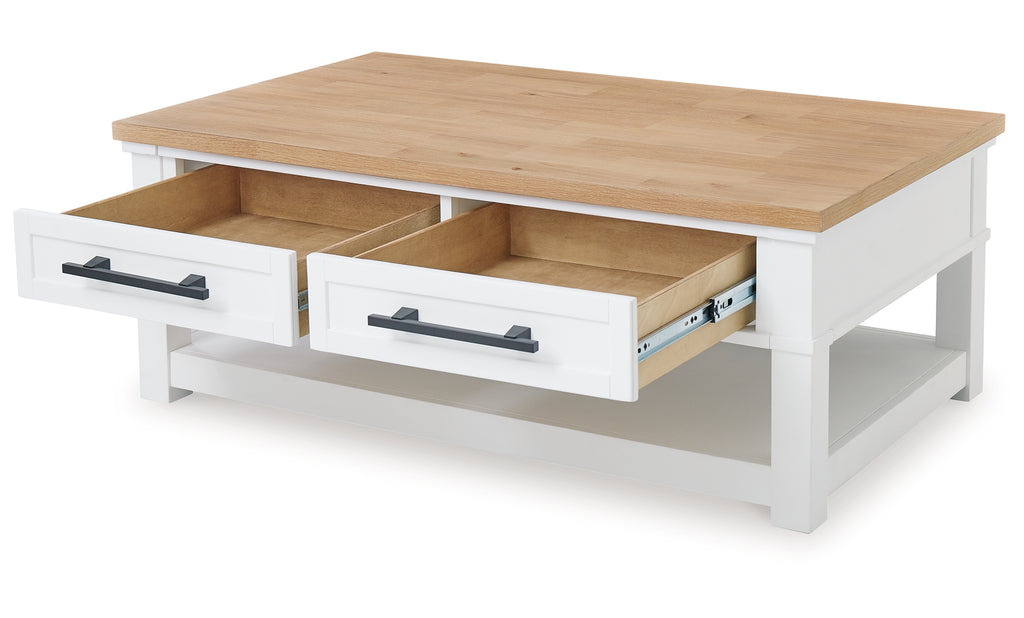 Casual style with substance. This two-tone coffee table raises the bar on comfortably cozy design. A sturdy silhouette with a classic white finish and black metal hardware exudes modern farmhouse vibes. The butcher block oak veneer top adds a relaxed aesthetic. And with two storage drawers and a lower shelf, this charmingly curated piece lets you display or tuck away. | Product Features