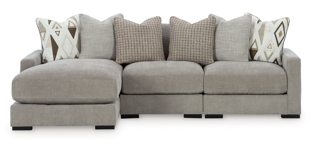 Customizable, contemporary comfort. This modular sofa sectional with chaise changes as your living room needs do. You can stage and rearrange the pieces as you please, whether it’s for family TV time, hosting guests or a simple style refresh. Adding to the sectional's versatility: a goes-with-anything neutral hue. And it keeps your relaxation a priority, with ultra-plush feather blend seat cushions rounding out the upscale design. | Product Features