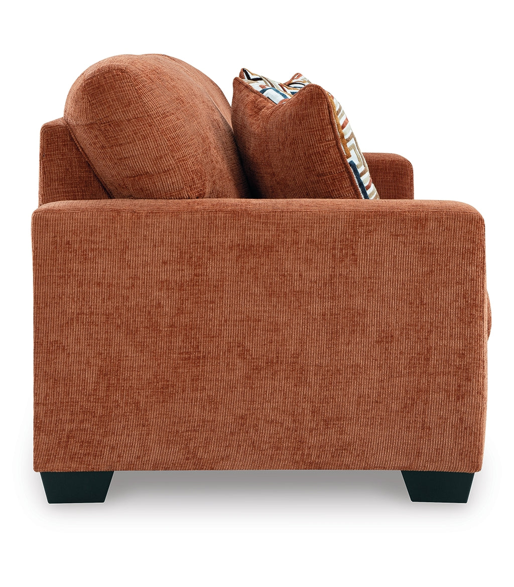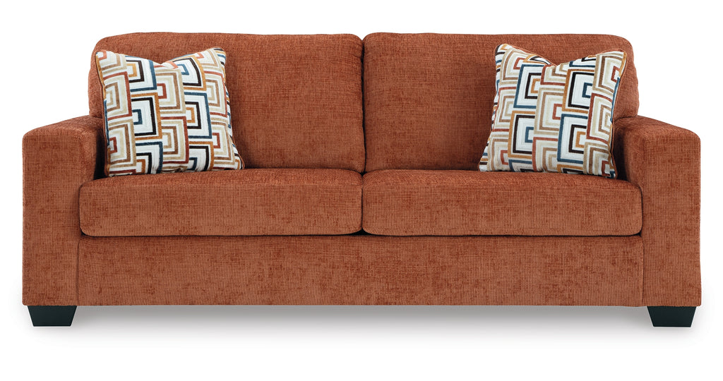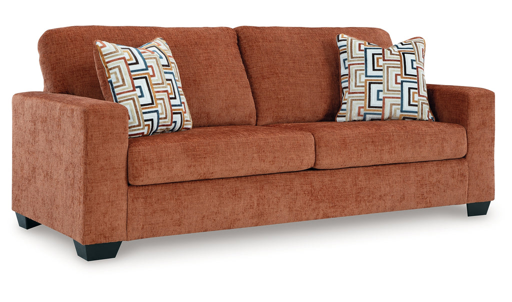 Looking to make a bold statement with color? Liven up your living room with this sofa. Its trend-right burnt orange upholstery adds a playful pop of color to your decor. Bold and eclectic accent pillows complete the look. Pairing posh style with everyday comfort, this piece is a welcome addition to contemporary spaces. | Product Features