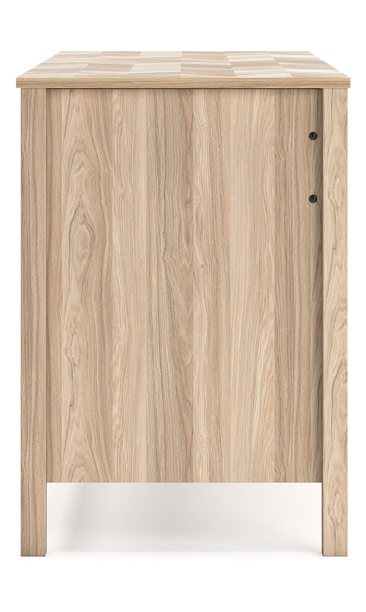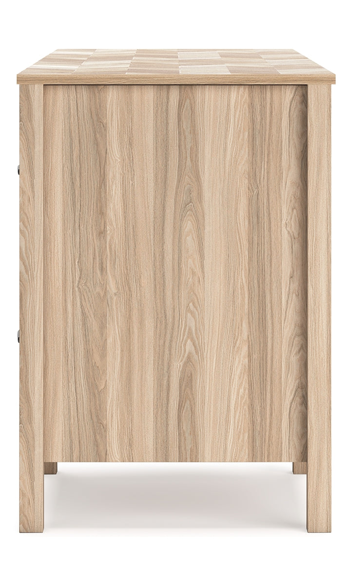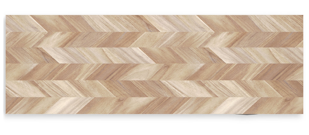 - Two-tone finish (dry, light finish over replicated oak grain; light chevron pattern)