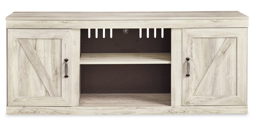 Express your modern farmhouse style with this TV stand with fireplace. Its wispy white finish over replicated oak grain is a delightful change from the ordinary. The clean-lined, classic styling with barn door inspiration provides a country-chic aesthetic that’s a breath of fresh air. What really turns up the heat: an electric infrared fireplace insert with faux firebrick surround that operates with or without infrared heat. With the touch of a button, adjust the temperature and the flame brightness, and set the timer for long-lasting enjoyment. | Product Features