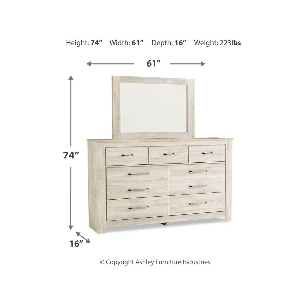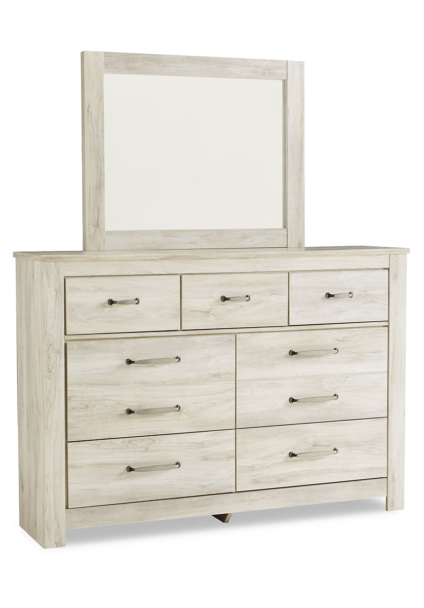 Your bedroom isn’t just a room. It’s a canvas. Express your farmhouse style with this dresser and mirror set. Wispy white finish over replicated oak wood grain brightens up the space with charm. Brushed nickel-tone handles with black edging finesse the piece with a bit of shine. Drawers are spacious and lined with faux linen laminate to hold your belongings with care. This clean-lined profile is the perfect authentic foundation for inviting decor. | Product Features