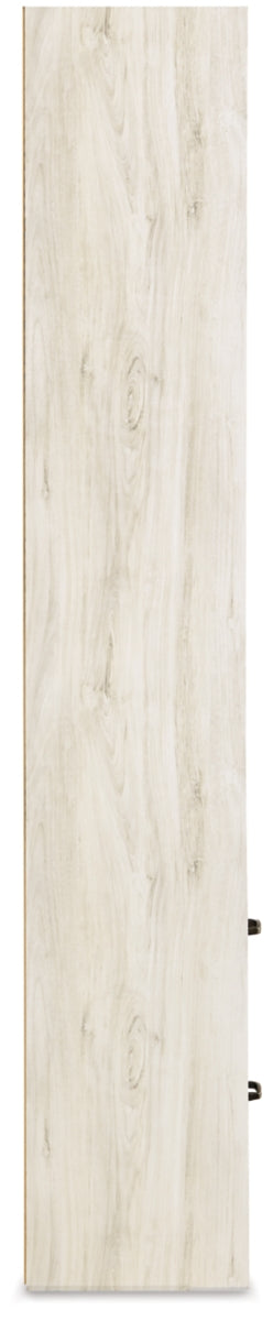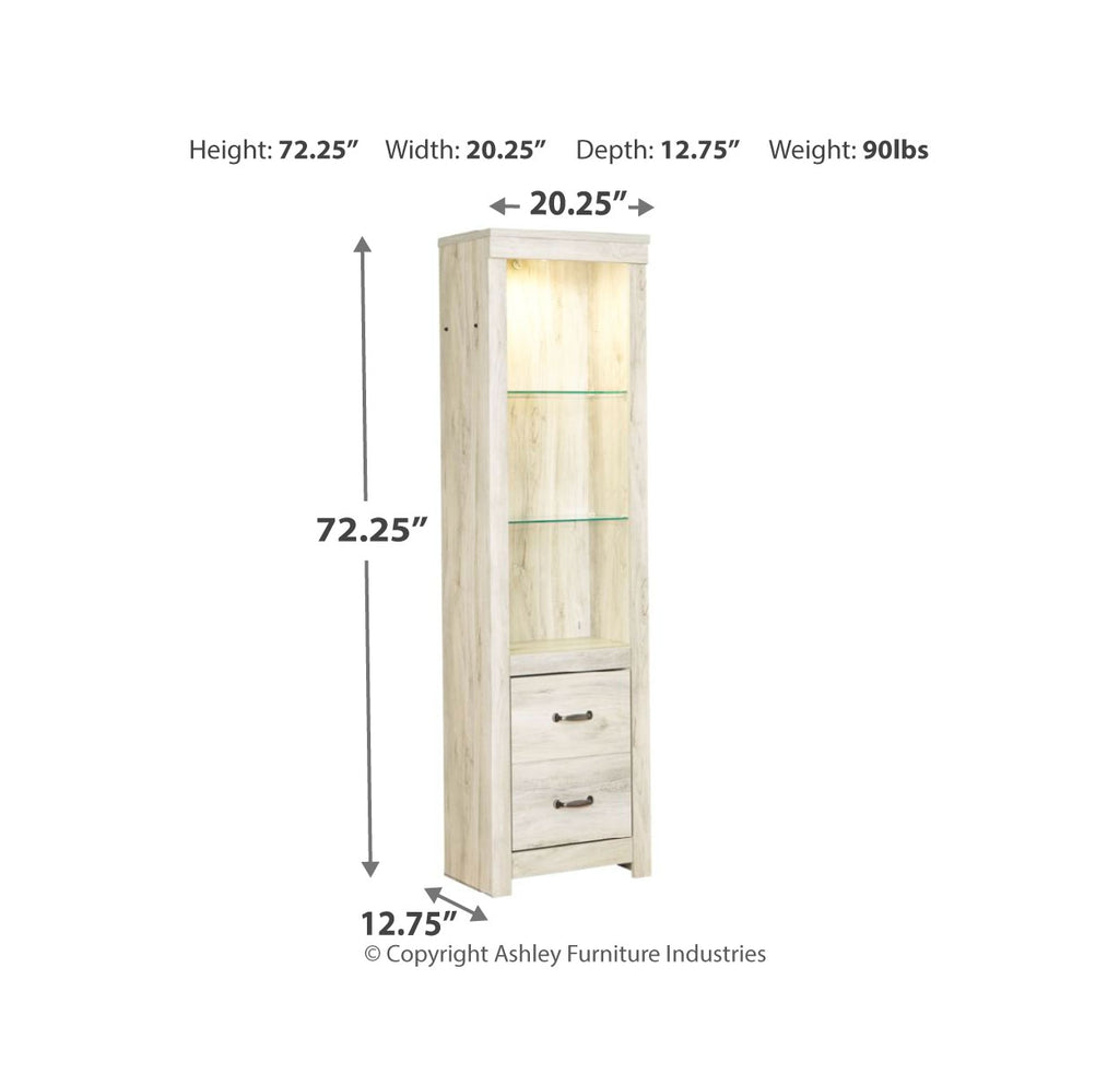 Express your farmhouse style with this TV pier. Its wispy white finish over replicated oak wood grain is a delightful change from the ordinary. Clean-lined styling gives the country chic aesthetic a fresh, contemporary appeal. The reversible door can open left or right with consumer assembly modification. | Product Features