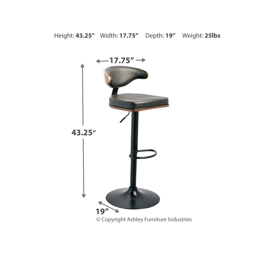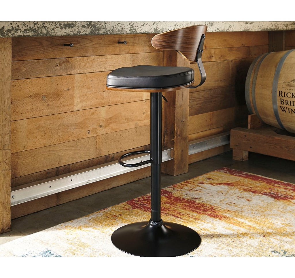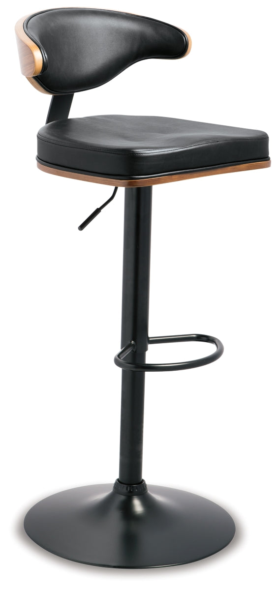 Style takes quite a modern turn. Sporting a distinctively contoured back, this upholstered swivel bar stool is sure to bring an elevated look to your living space. Wrapped in a black faux leather upholstery, the seating area’s artful contours put the accent on comfort. | Product Features