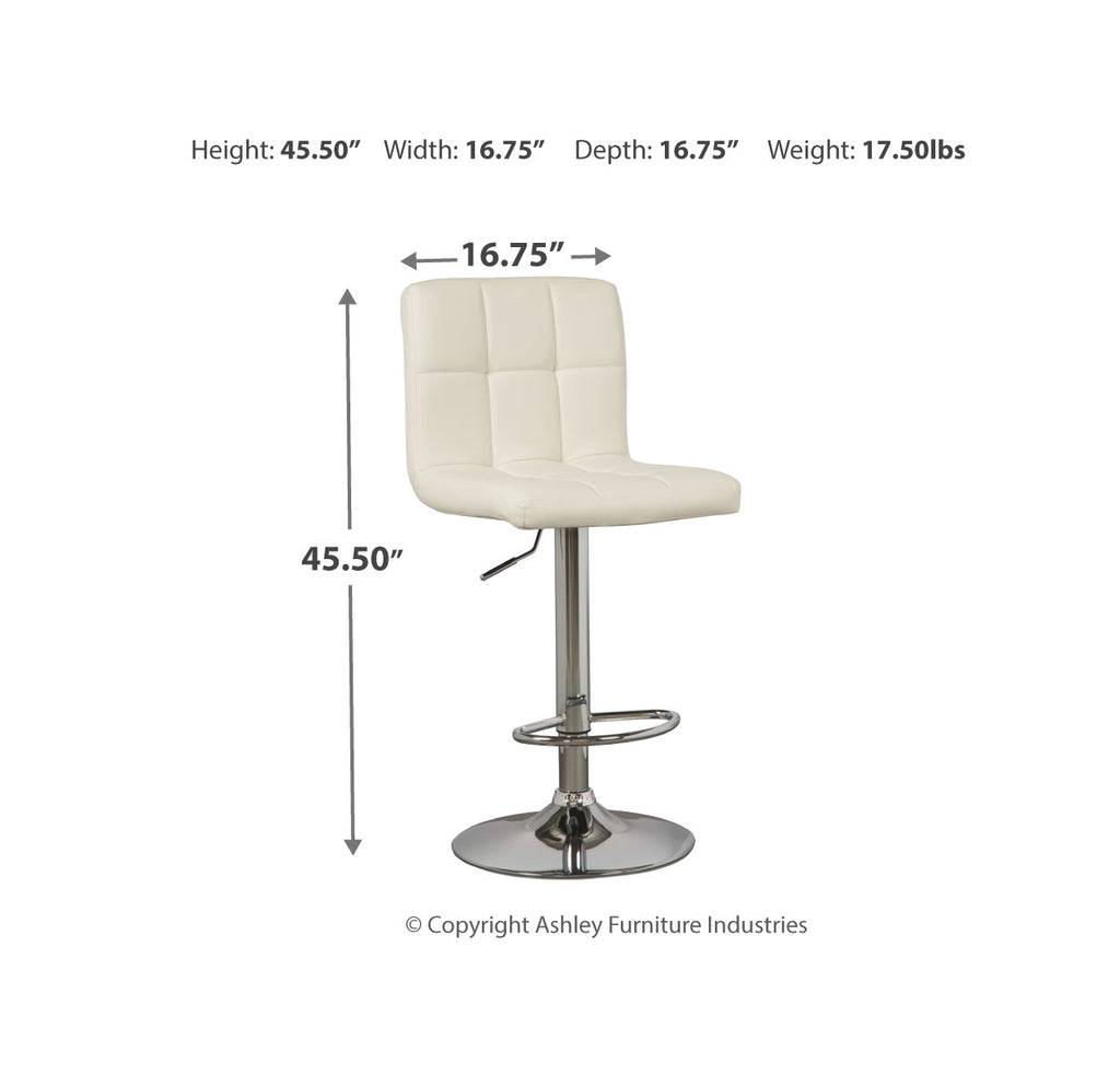 Here's a bar stool that rises to the occasion. It is sleek and modern with a chrome-tone finish. Square-tufted, bone-colored faux leather upholstery makes this bar stool pop. It easily adjusts from counter to pub height making it as versatile as it is attractive. This tall swivel bar stool is a perfect seat for any trendy home bar or game room. | Product Features