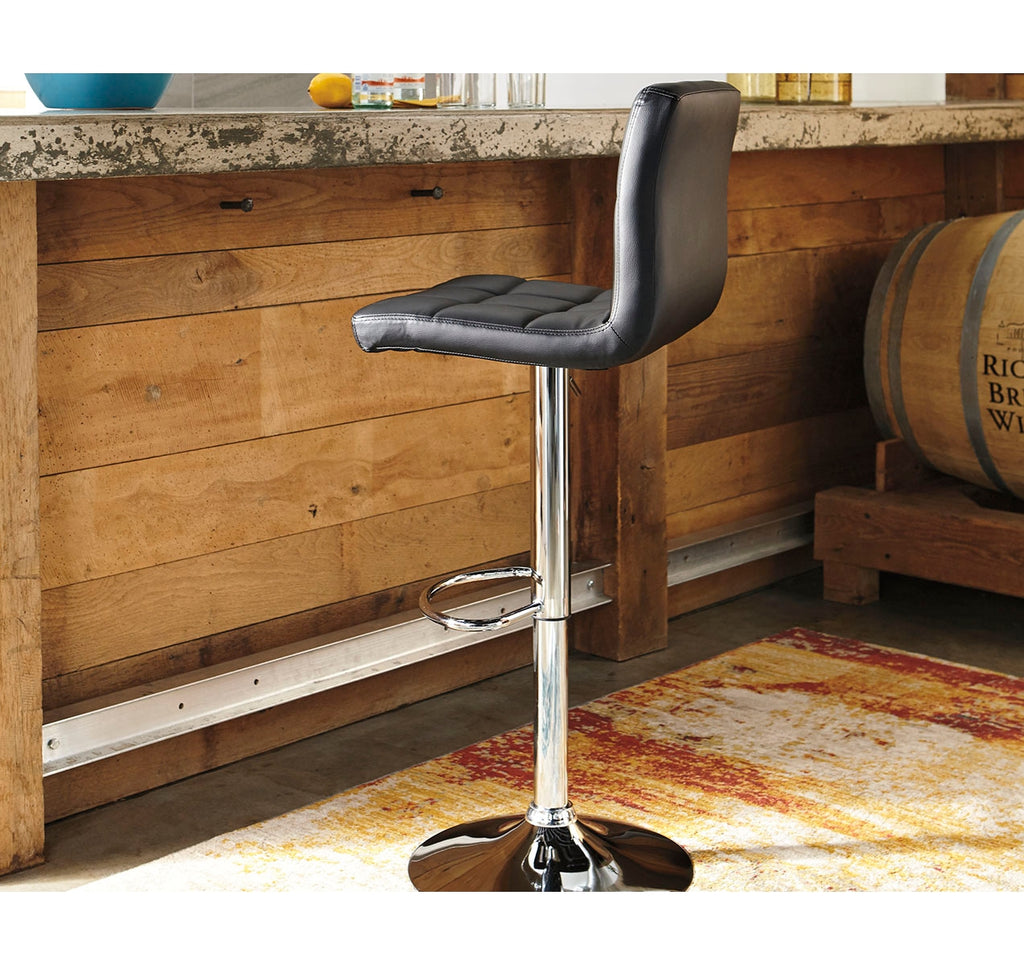 This upholstered swivel bar stool is ultra-contemporary style with a twist. Chrome-tone metal base is a sleek complement to the tailored cushioned seat with faux leather upholstery and squared tufting. | Product Features