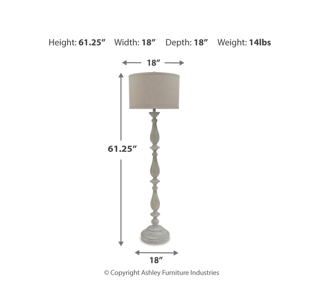 With its whitewash finish, this floor lamp is full of character and style. Its candlestick design and drum shade will add a dose of casual chicness to your living space. | Product Features