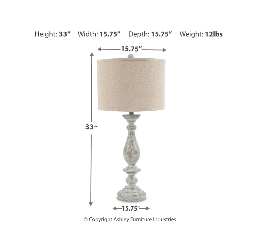 With its whitewash finish, this table lamp is full of character and style. Its candlestick design and drum shade will add a dose of casual chicness to your living space. | Product Features