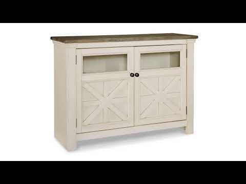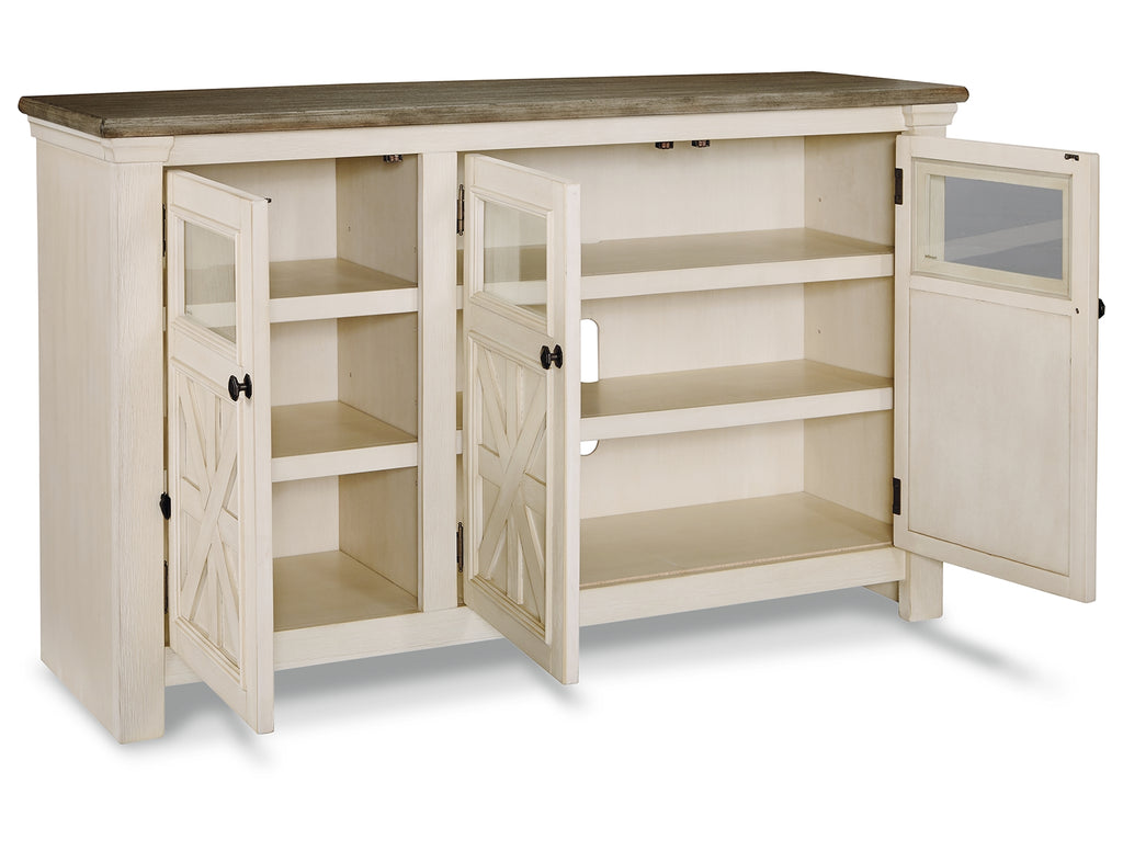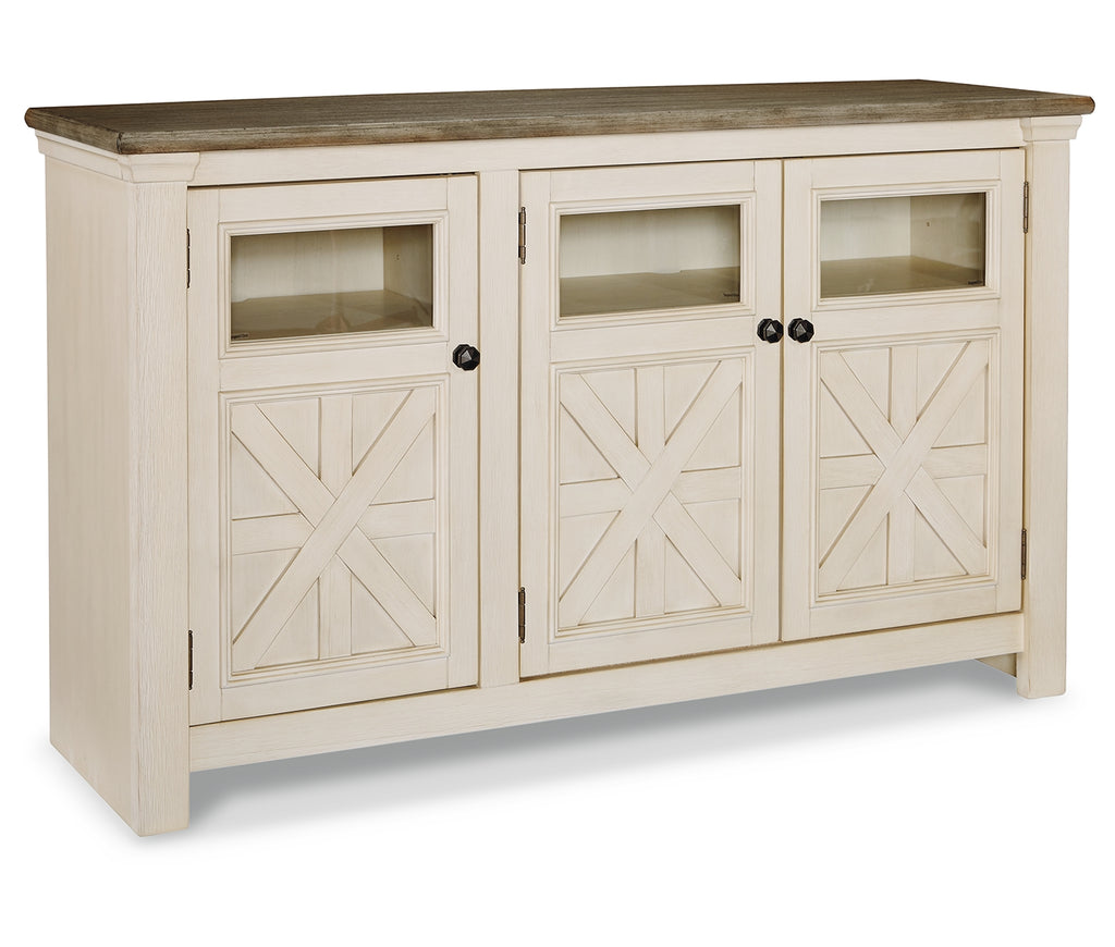 Whether your style is farmhouse fresh, shabby chic or country cottage, you’ll find this large TV stand perfectly in tune. Its two-tone finish pairs a trendy textured antiqued white with a weathered gray for that much more quaint character. Charming elements include crossbuck adorned cabinet doors with glass inlays for peek-through flair. Ample adjustable shelving and cutouts for wire management nicely accommodate your media needs. | Product Features