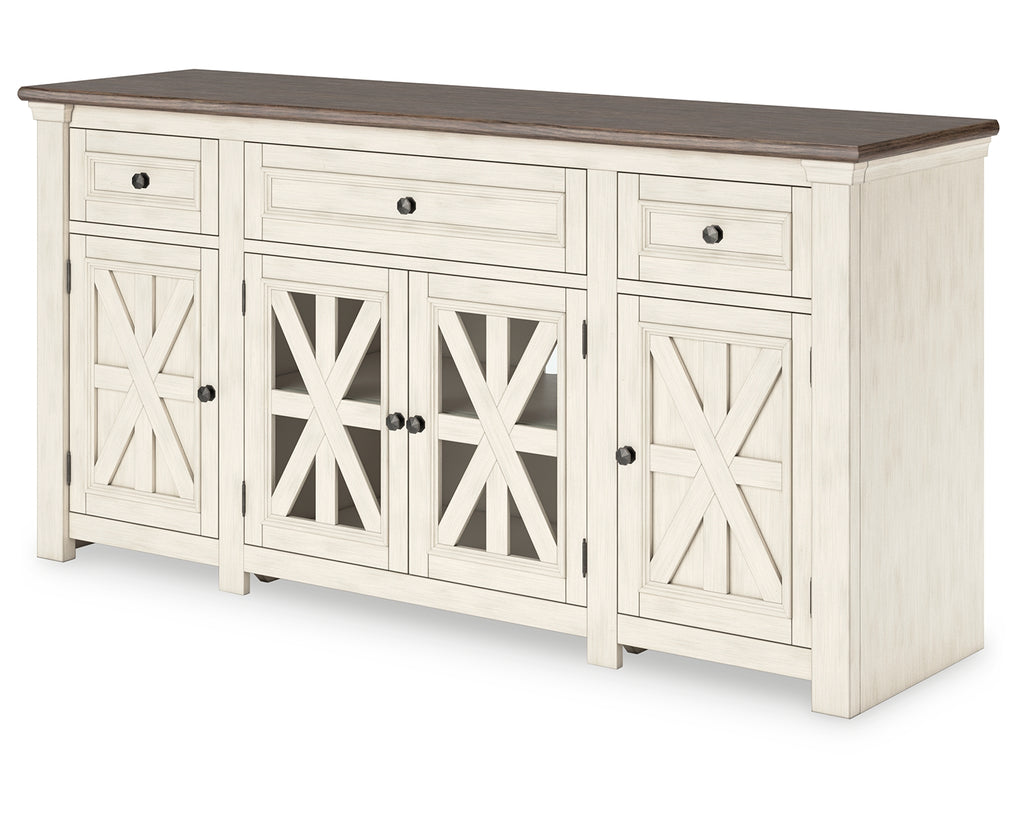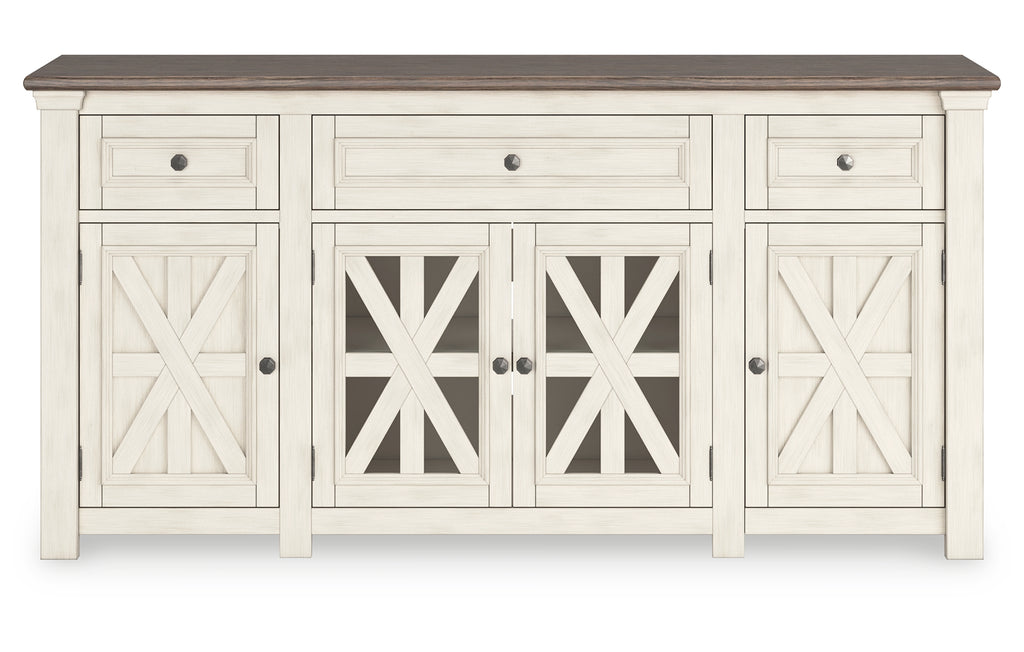 Whether your style is farmhouse fresh, shabby chic or country cottage, you’ll find this TV stand perfectly in tune. Its two-tone finish pairs a trendy textured antiqued white with weathered gray for that much more quaint character. Charming elements include crossbuck-adorned cabinet doors with glass inlays for peek-through flair. Ample storage space and cutouts for wire management nicely accommodate your media needs. | Product Features