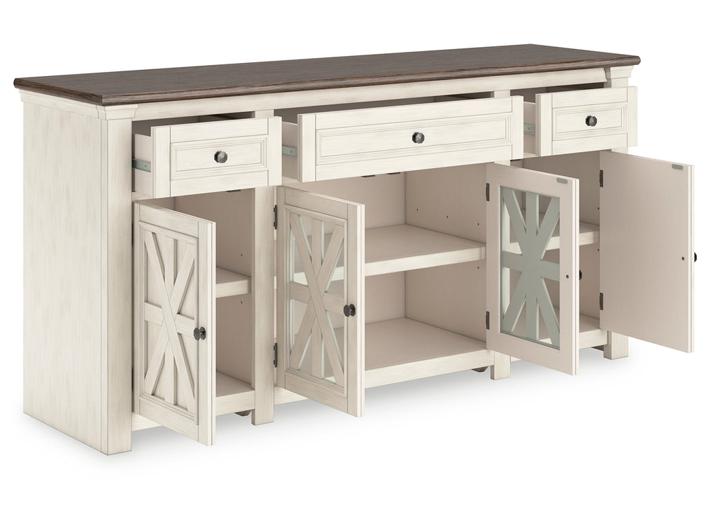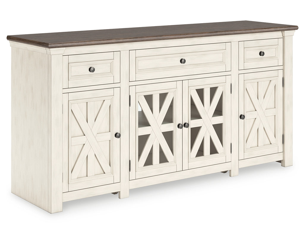 - 3 storage cabinets; center doors with inset glass