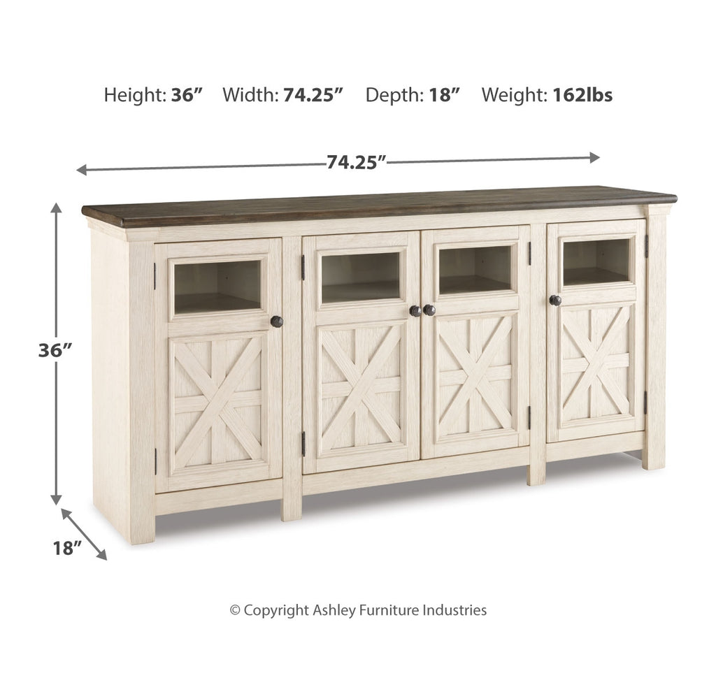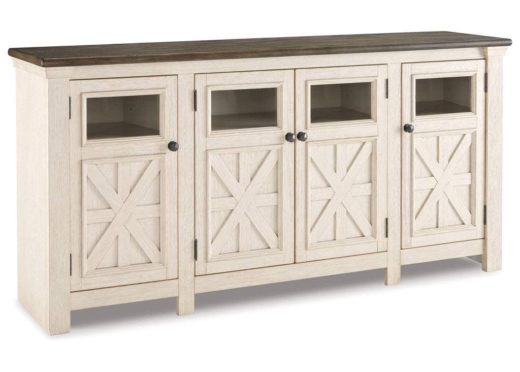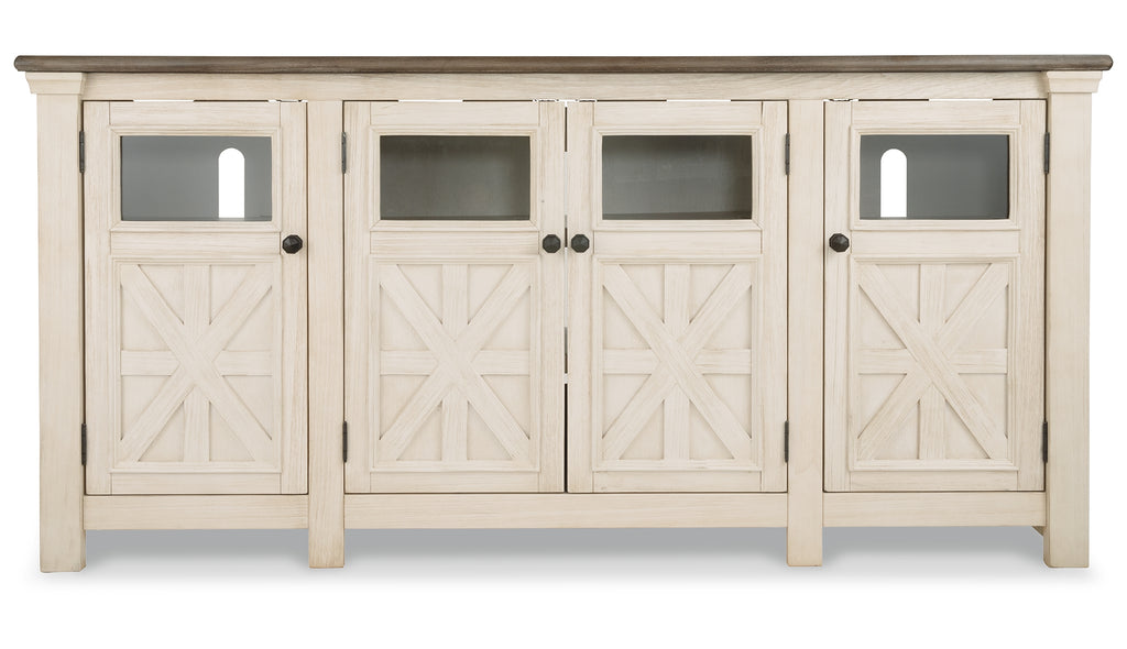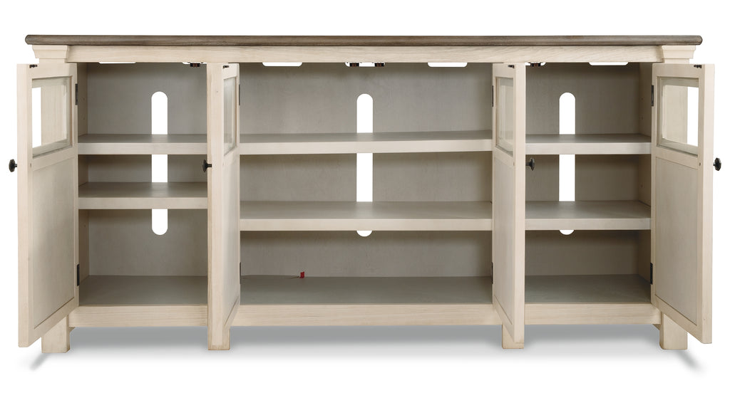 Whether your style is farmhouse fresh, shabby chic or country cottage, you’ll find this extra large TV stand perfectly in tune. Its two-tone, gently distressed finish pairs weathered oak with antiqued white for that much more quaint character. Charming elements include crossbuck adorned cabinets with glass inlays for peek-through flair. Ample adjustable shelving and cutouts for wire management nicely accommodate your media needs. | Product Features