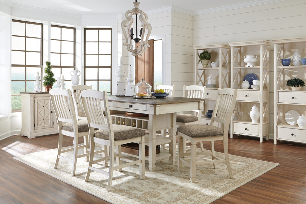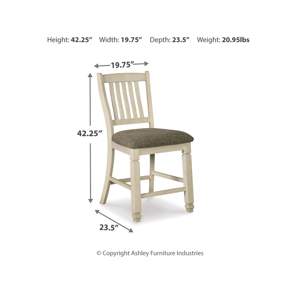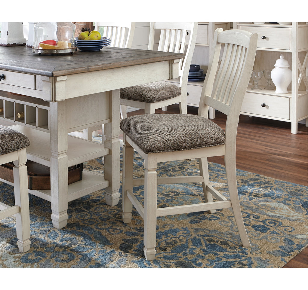 The beauty of this upholstered bar stool is something to savor. Designed to serve up comfort and flair, this rake-back bar stool entices with a cushioned seat covered in a heavy woven fabric that complements the antiqued white finish. | Product Features