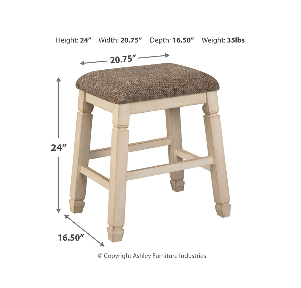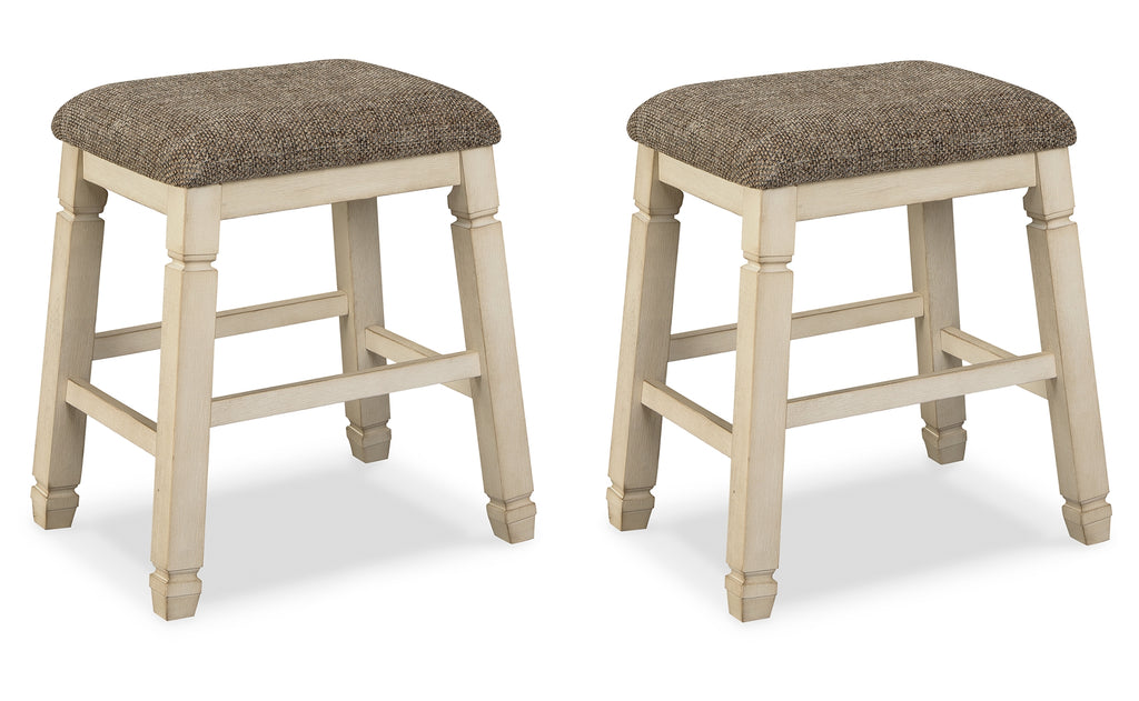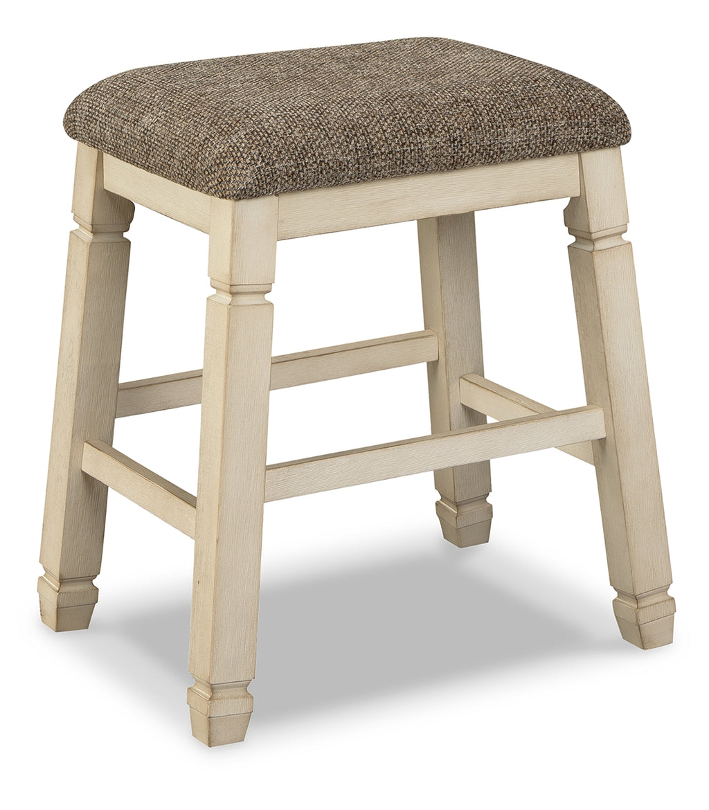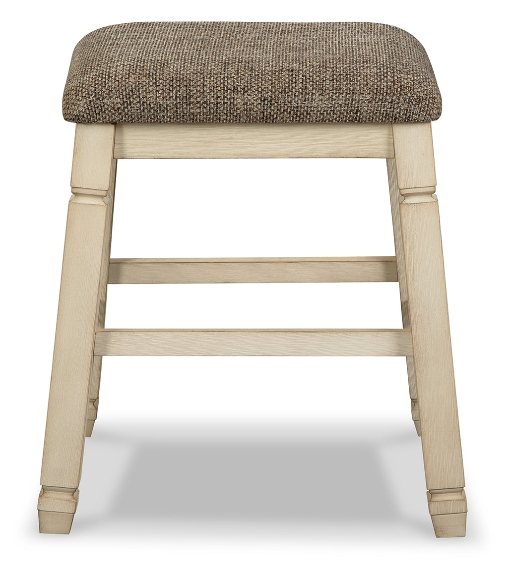 The beauty of this upholstered bar stool is something to savor. Designed to serve up comfort and flair, this backless bar stool entices with a saddle seat covered in a heavy woven fabric that complements the antiqued white finish. | Product Features