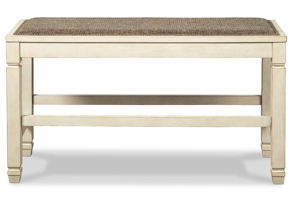 The beauty of this upholstered dining bench is something to savor. Serving up comfort and flair, this generously scaled counter-height bench entices with a cushioned seat covered in a heavy woven fabric that complements the antiqued white finish. | Product Features