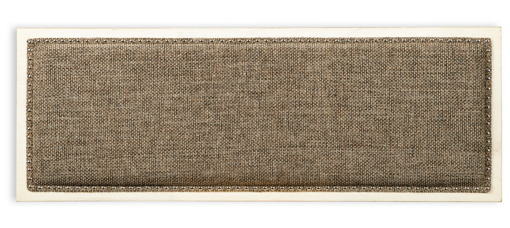 - Heavy woven fabric upholstered seat with nailhead trim
