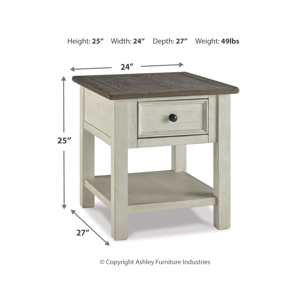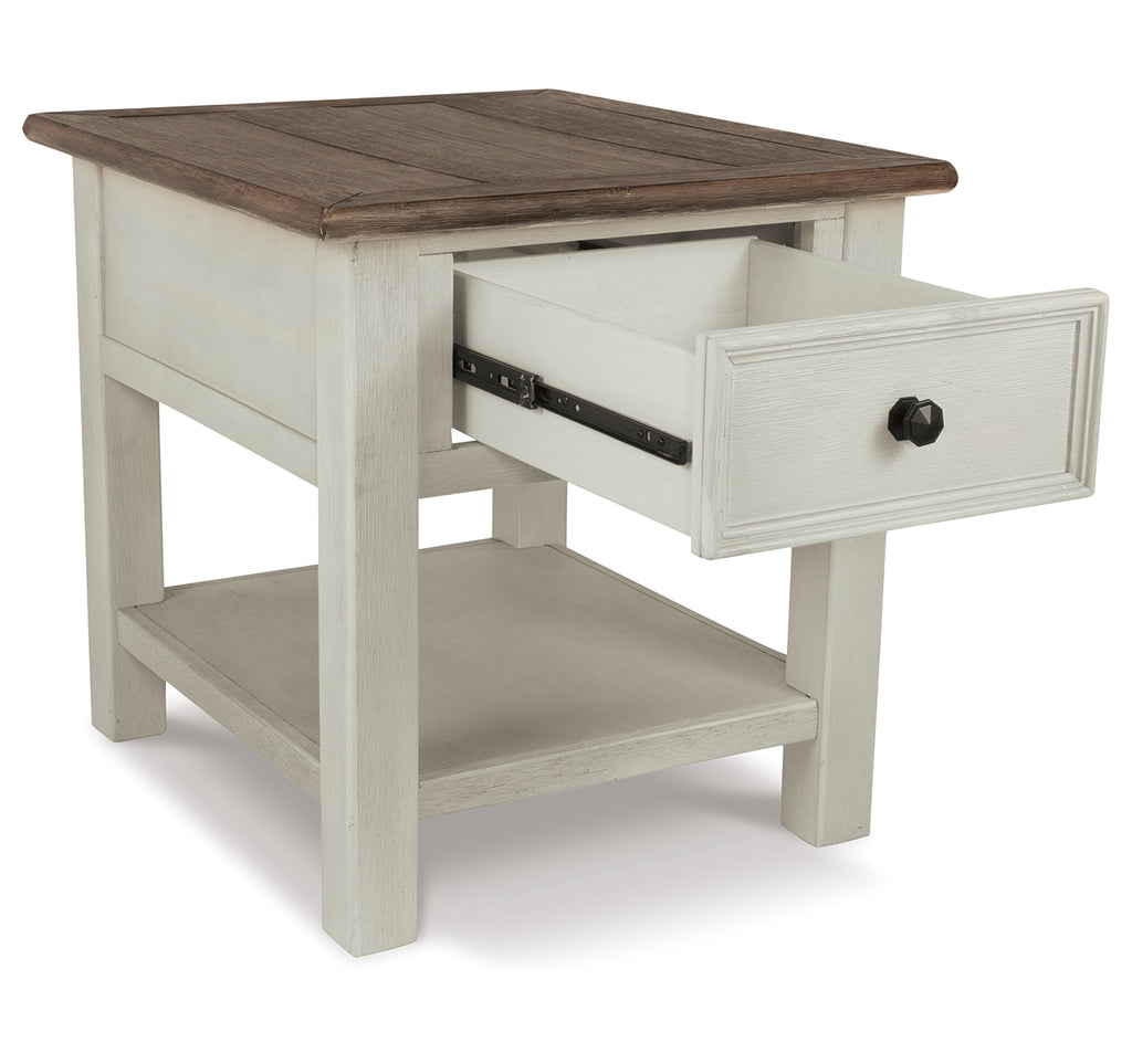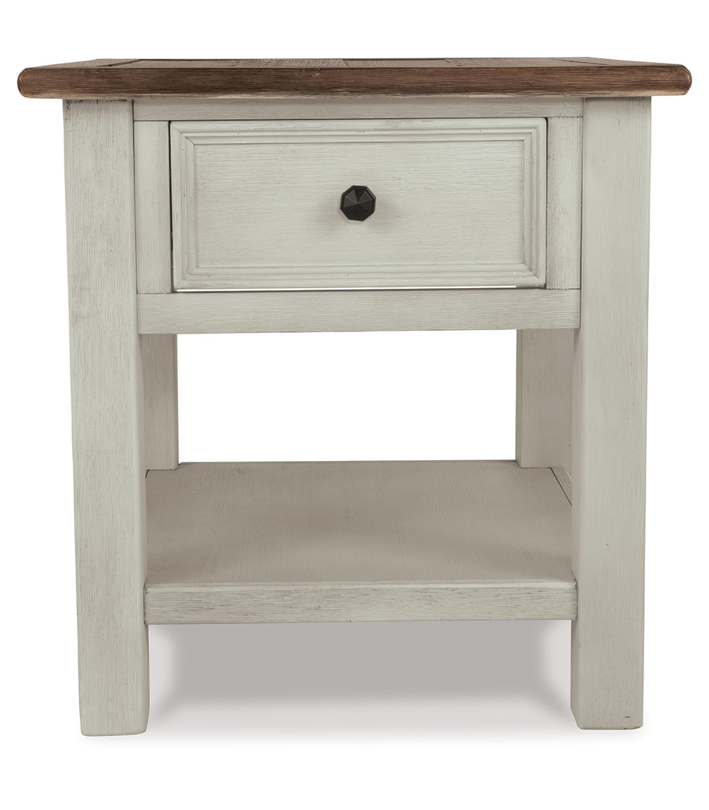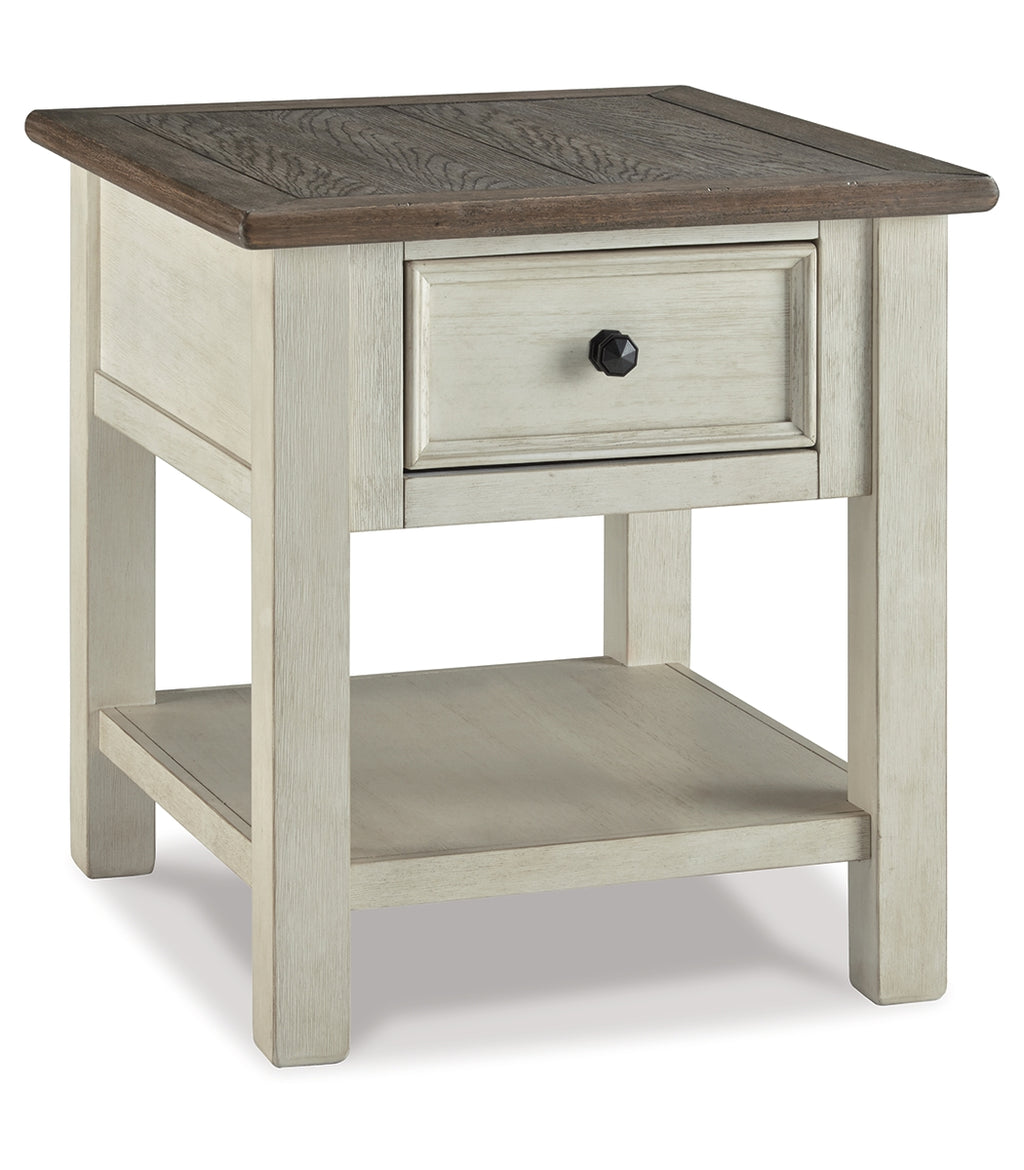 Whether your style is farmhouse fresh, shabby chic or country cottage, you’ll find this end table dressed to impress. Its two-tone, gently distressed finish pairs weathered oak with antique white for that much more quaint character. Charming elements include a plank-and-frame style top, black faceted hardware and a smooth-gliding drawer for remote controls and more. | Product Features