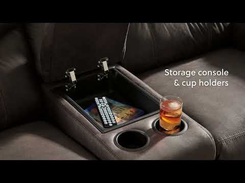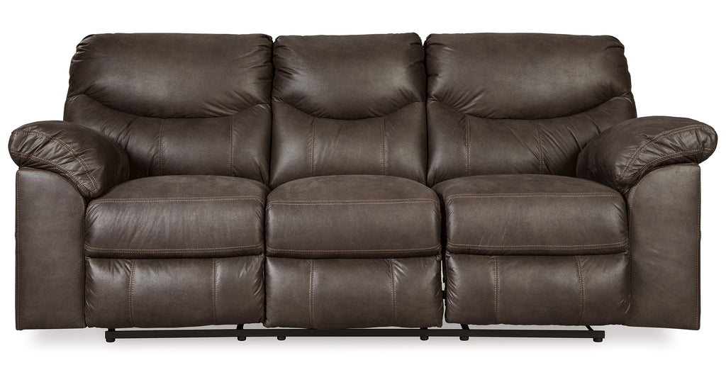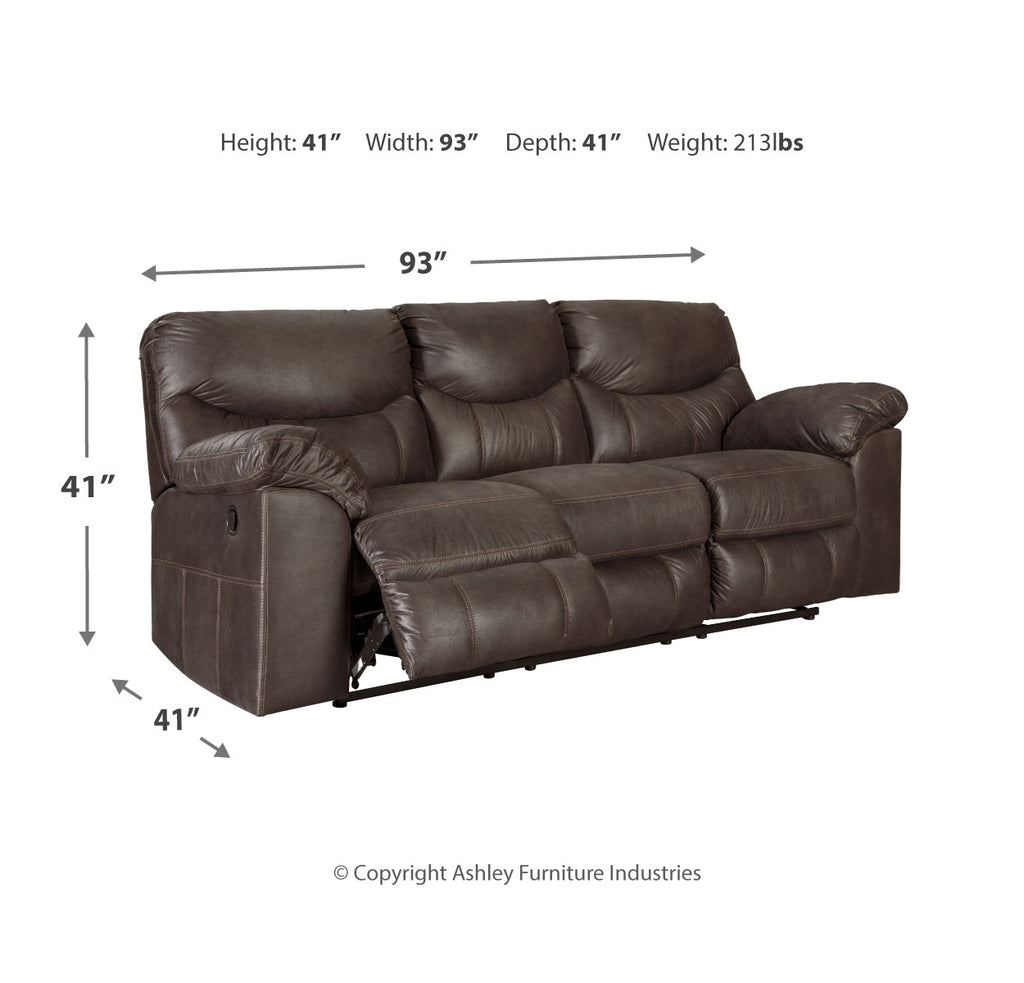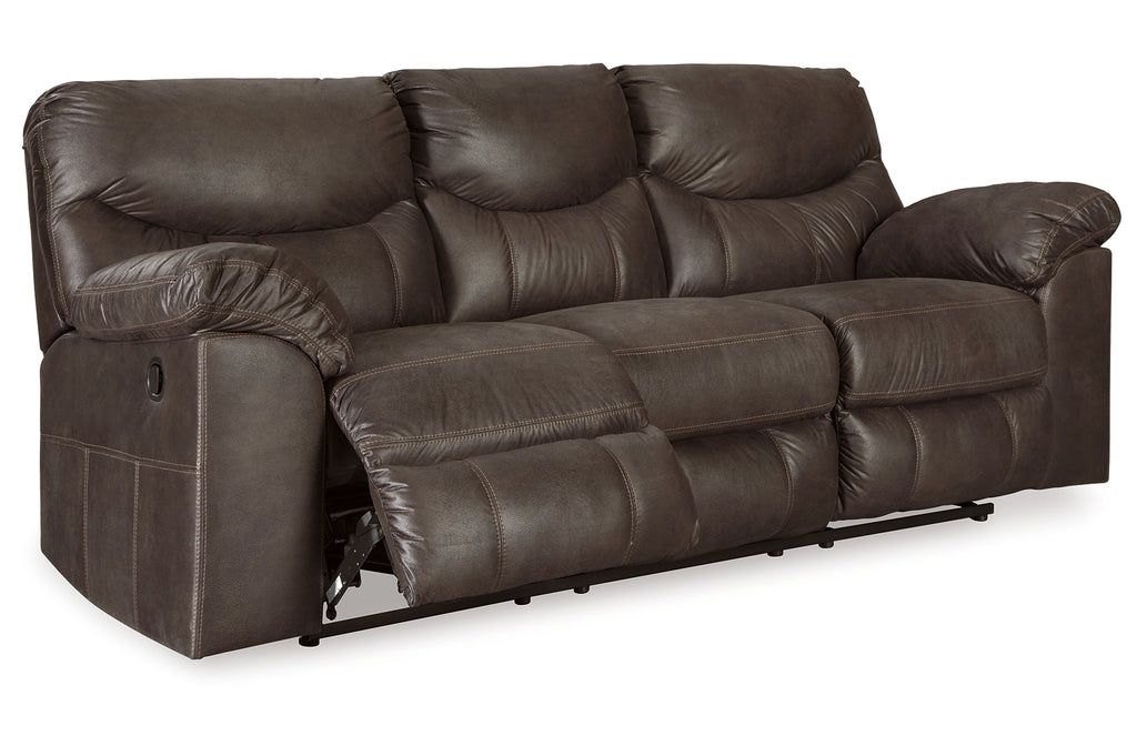 Rock the cool look of leather minus the hefty price tag with this reclining sofa. Rich with tonal variation, the indulgently soft upholstery sure looks like the real thing. And talk about indulgent comfort. Double stuffed armrests and sumptuous cushions cradle and support in all the right places. Distinctive scooped stitching enhances this reclining sofa’s contemporary flair. | Product Features