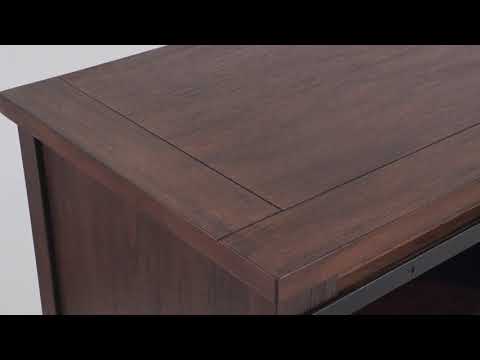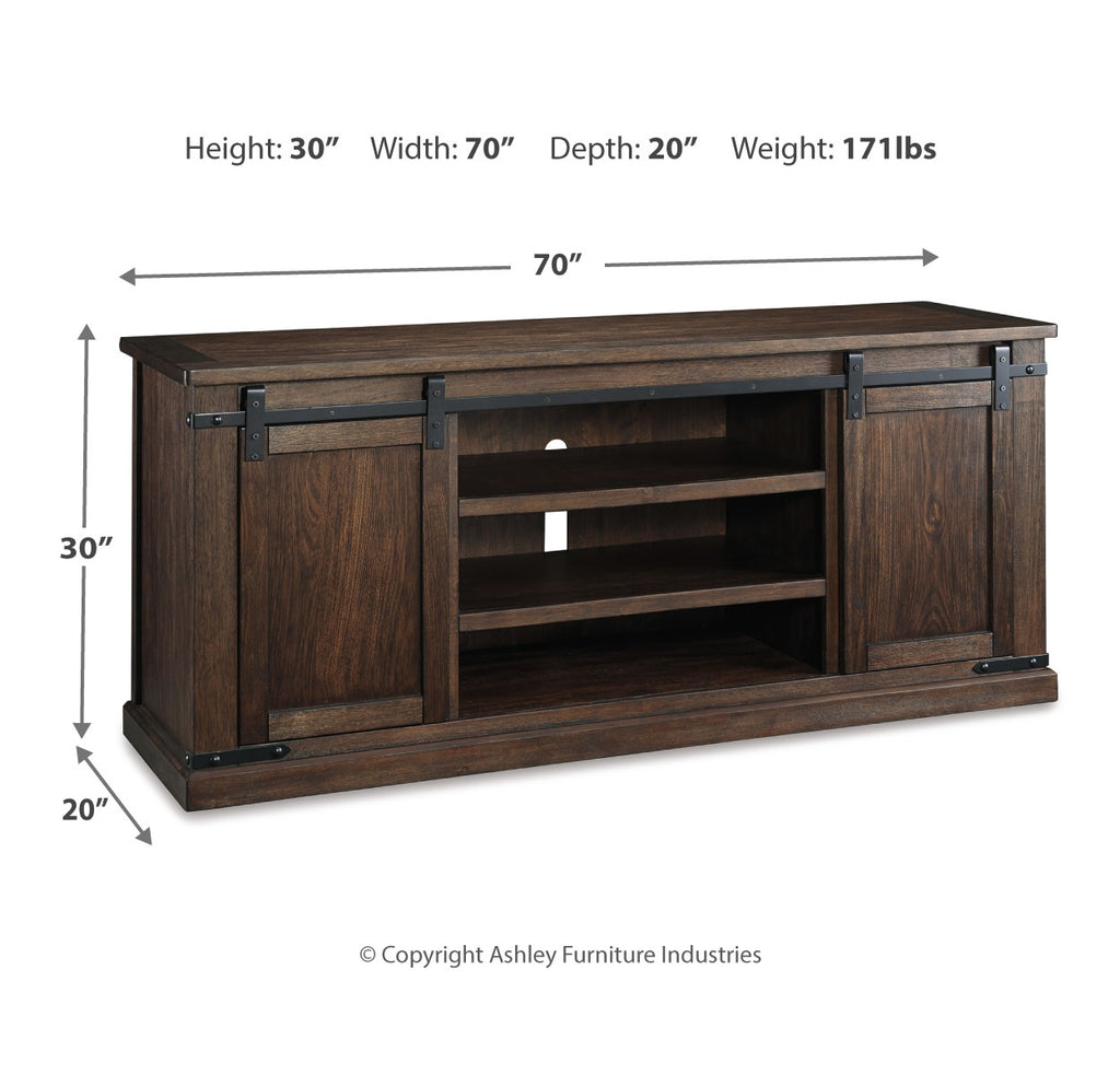 Add a big touch of country style to your living area with this extra large 70" TV stand. It’s visually appealing with the flexibility you need. Adjustable end shelves offer lots of storage, while the two stationary middle shelves are roomy for housing media equipment. Two sliding barn doors can easily be positioned as you desire. For an uncluttered look, slide the doors over the two ends and use those areas for hidden storage—what a deal. | Product Features