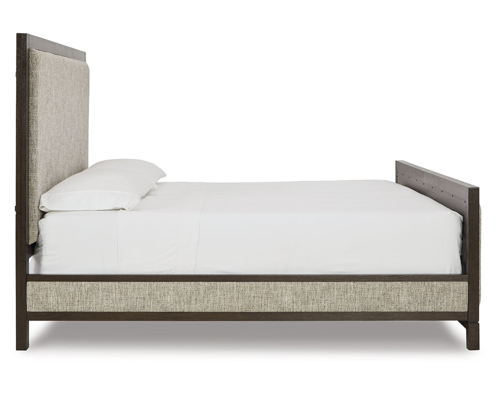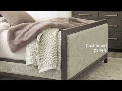 Dressed to thrill, this simply stunning California king upholstered bed offers a high-design look at a down-to-earth price. Ultra sleek lines are accentuated with a dark waxy brown oak-tone finish that’s so easy on the eyes. Cushioned panels emphasize the bed’s clean, modern lines, while luxurious cream and black upholstery completes the upscale aesthetic. | Product Features