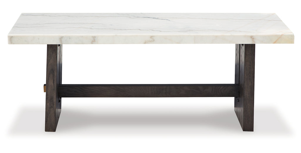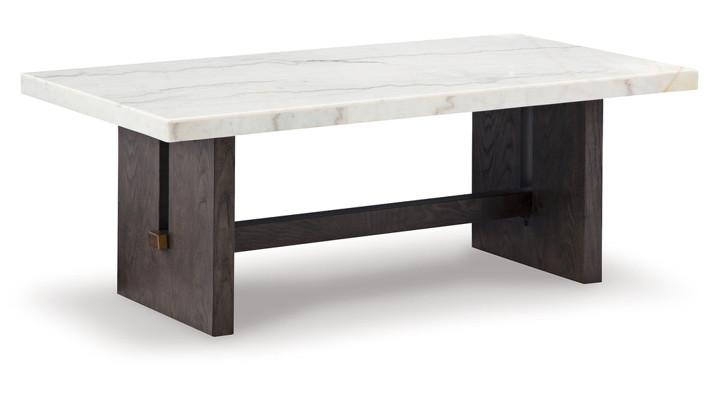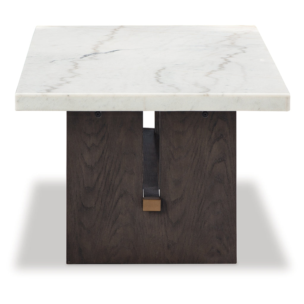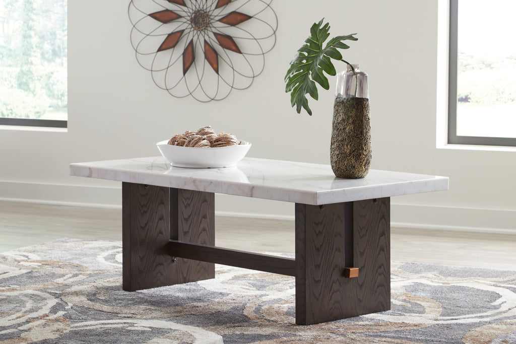 Dressed to thrill, this simply stunning coffee table offers a high-design look at a down-to-earth price. Ultra-sleek lines are accentuated with a dark waxy brown oak finish that’s so easy on the eyes. Clean-lined and modern, the plinth base and natural marble tabletop showcase quality craftsmanship and attention to detail. This table is the perfect centerpiece for a living room or family space, with a timeless look that's made to last. | Product Features