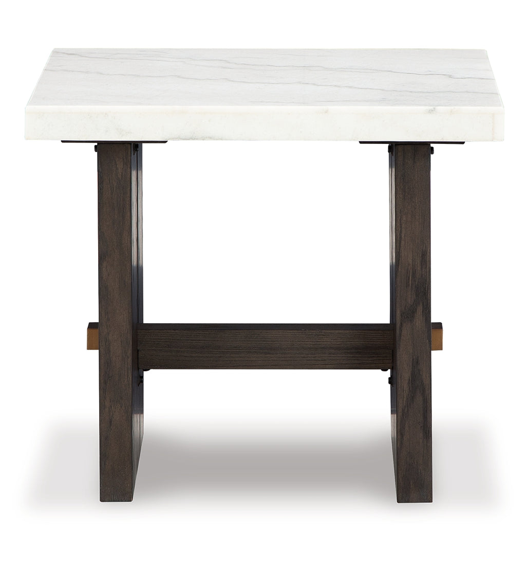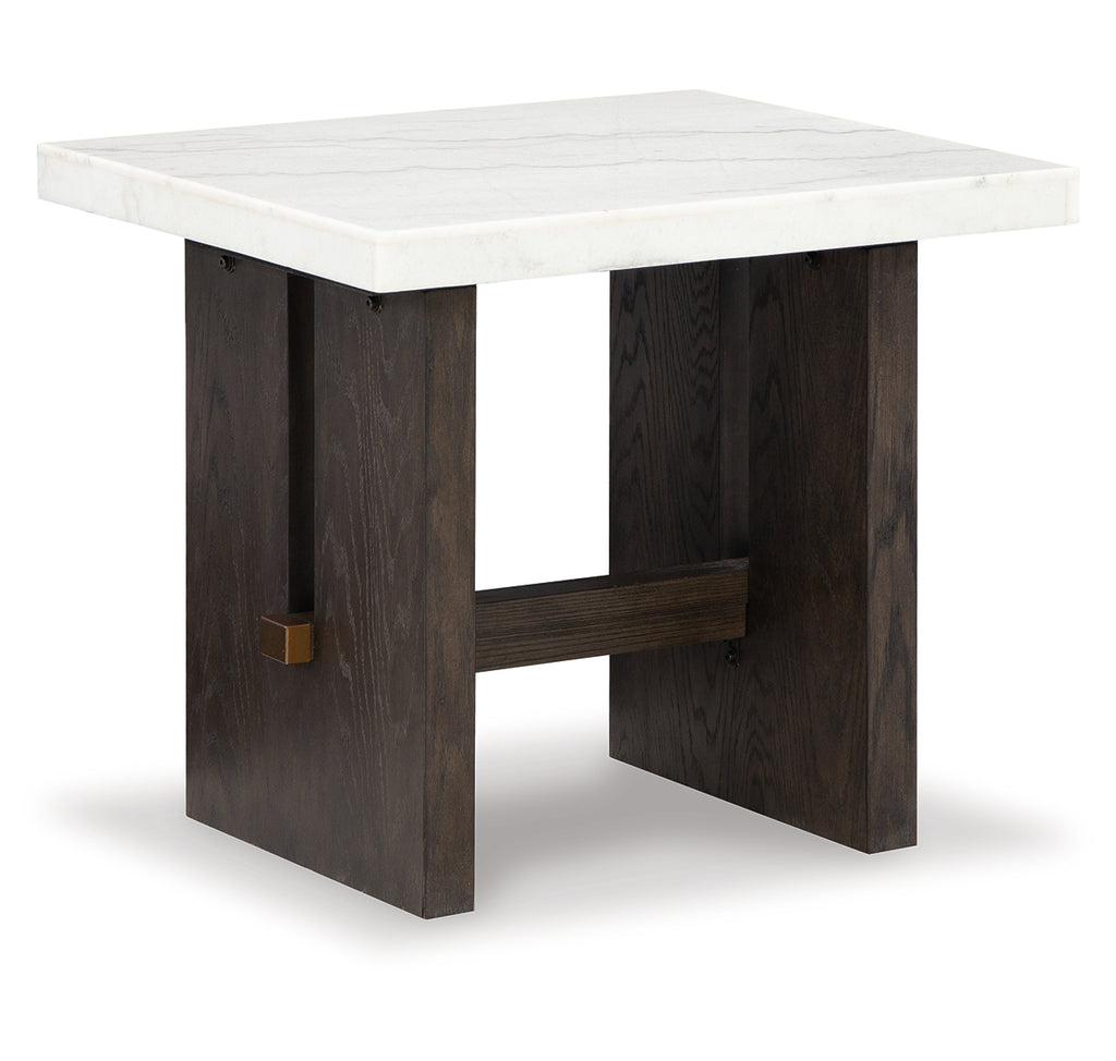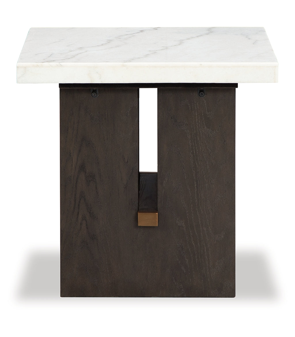 Dressed to thrill, this simply stunning end table offers a high-design look at a down-to-earth price. Ultra-sleek lines are accentuated with a dark waxy brown oak finish that’s so easy on the eyes. Clean-lined and modern, the plinth base and natural marble tabletop showcase quality craftsmanship and attention to detail. This table is the perfect sofa companion for a living room or family space, with a timeless look that's made to last. | Product Features
