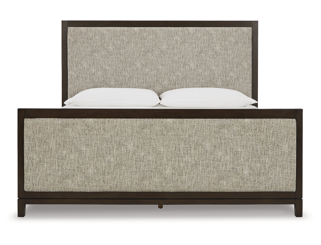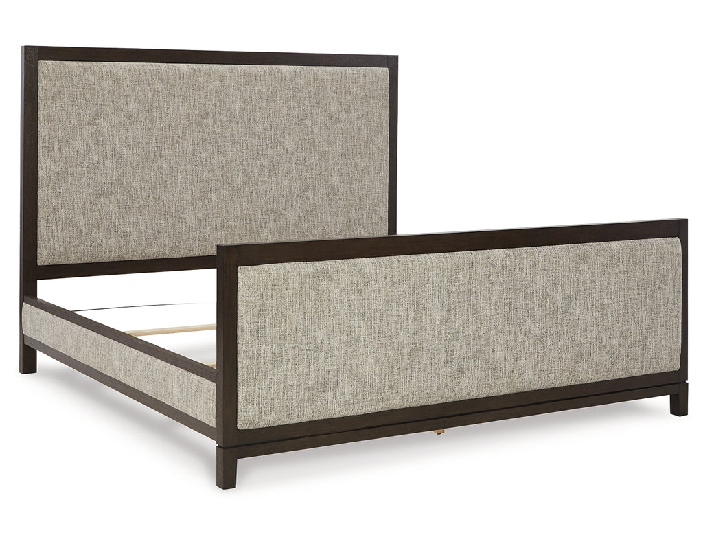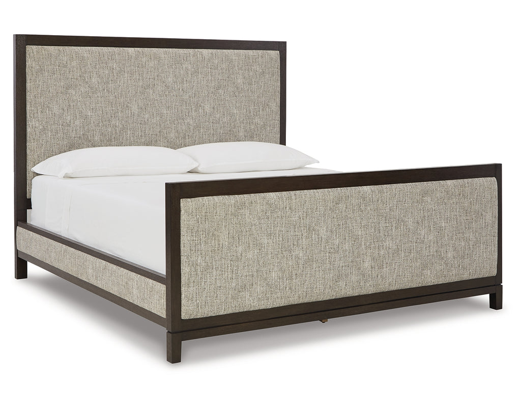 Dressed to thrill, this simply stunning king upholstered bed offers a high-design look at a down-to-earth price. Ultra sleek lines are accentuated with a dark waxy brown oak-tone finish that’s so easy on the eyes. Cushioned panels emphasize the bed’s clean, modern lines, while luxurious cream and black upholstery completes the upscale aesthetic. | Product Features