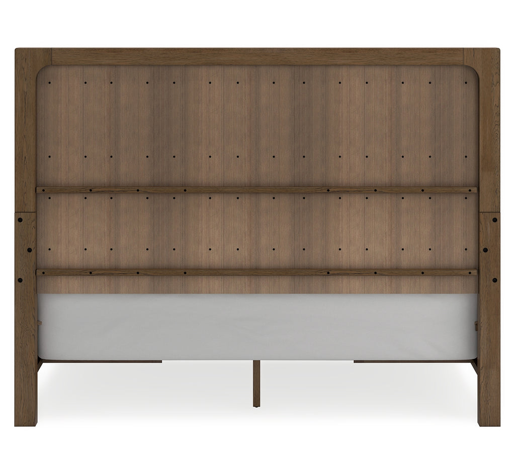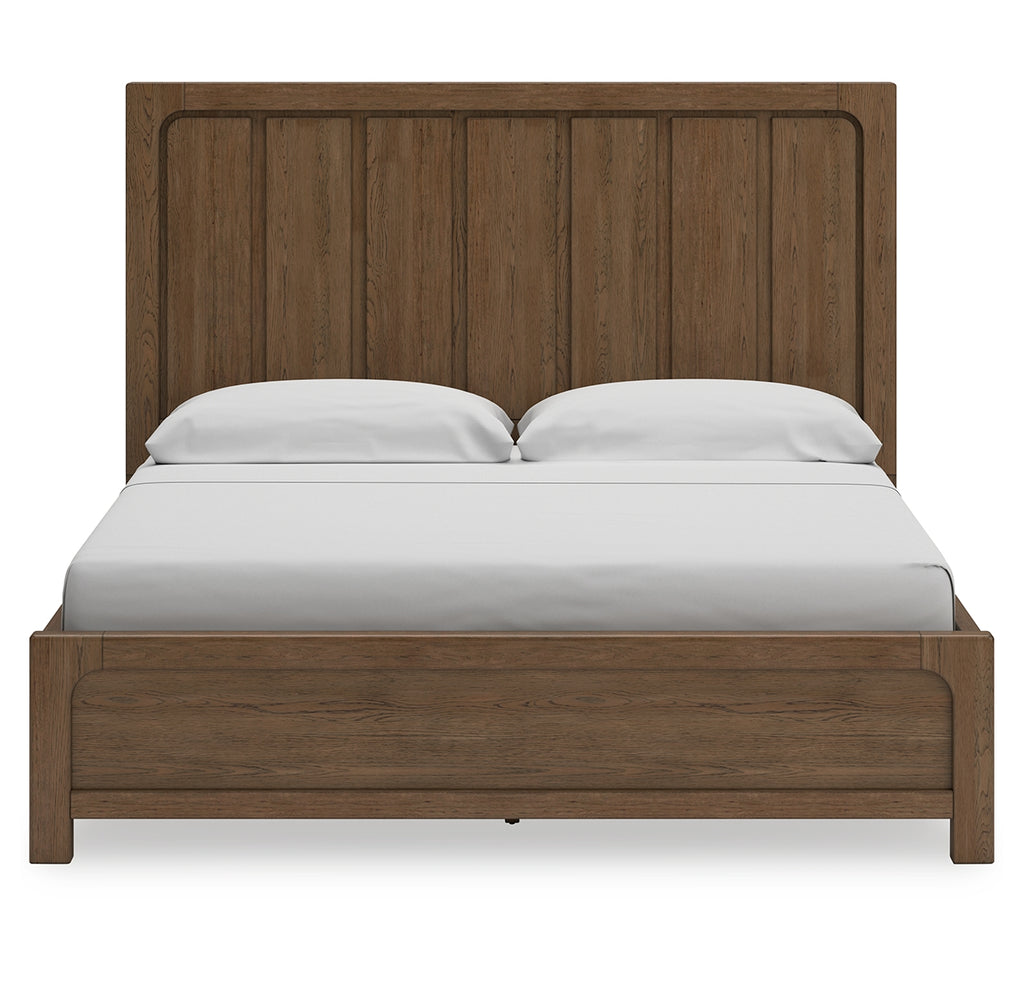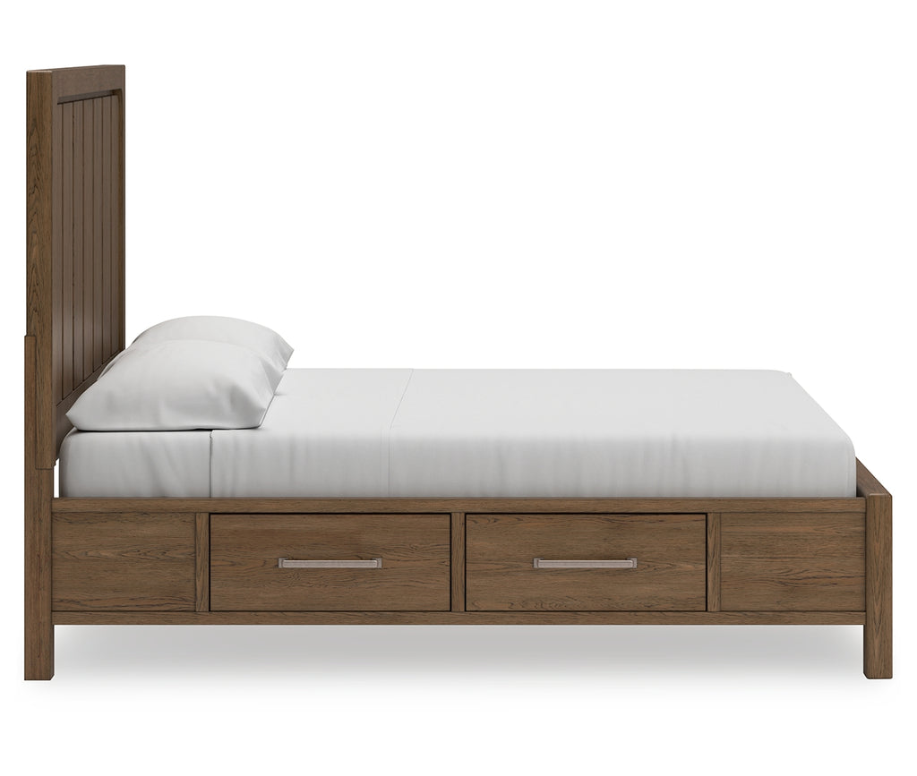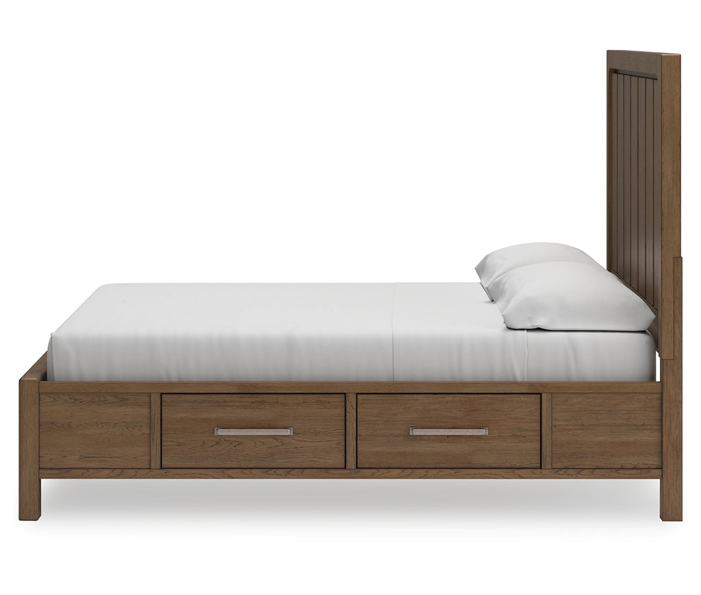 This California king panel bed with storage sits comfortably at the intersection of modern lodge and farmhouse aesthetics. Your warm and welcoming disposition is reflected in its charming architectural elements and light brown glazed finish. Even with its poise, this bed remains practical. Storage drawers are effective space-savers, defining your bedroom with reliable function and style. | Product Features