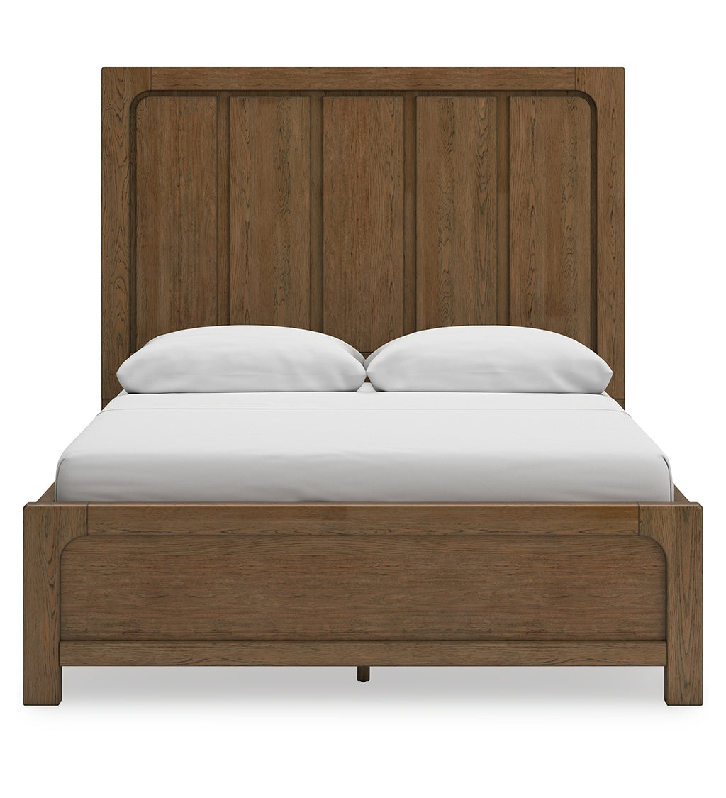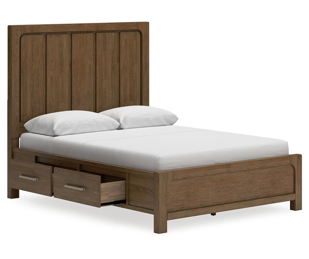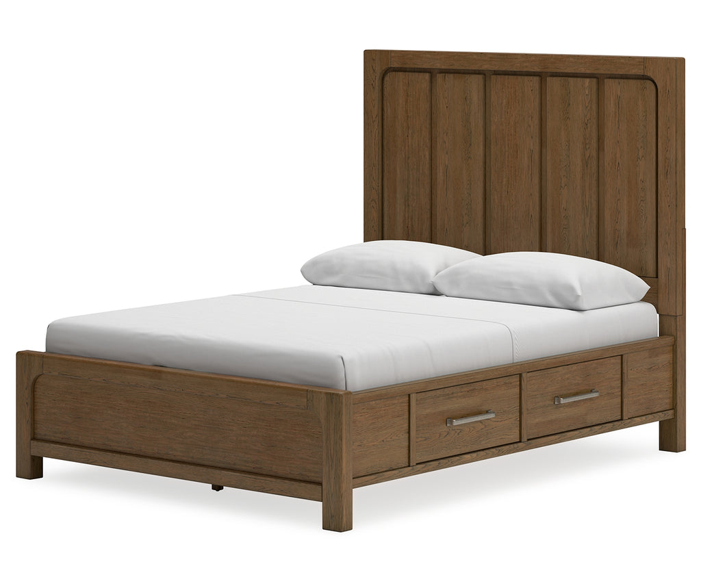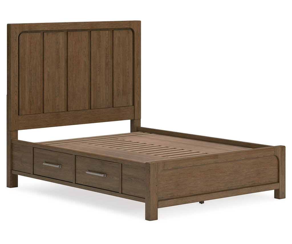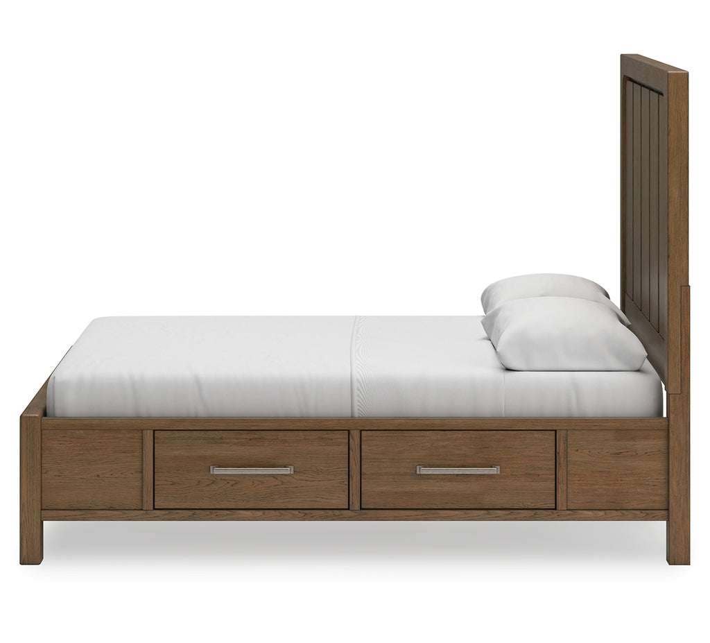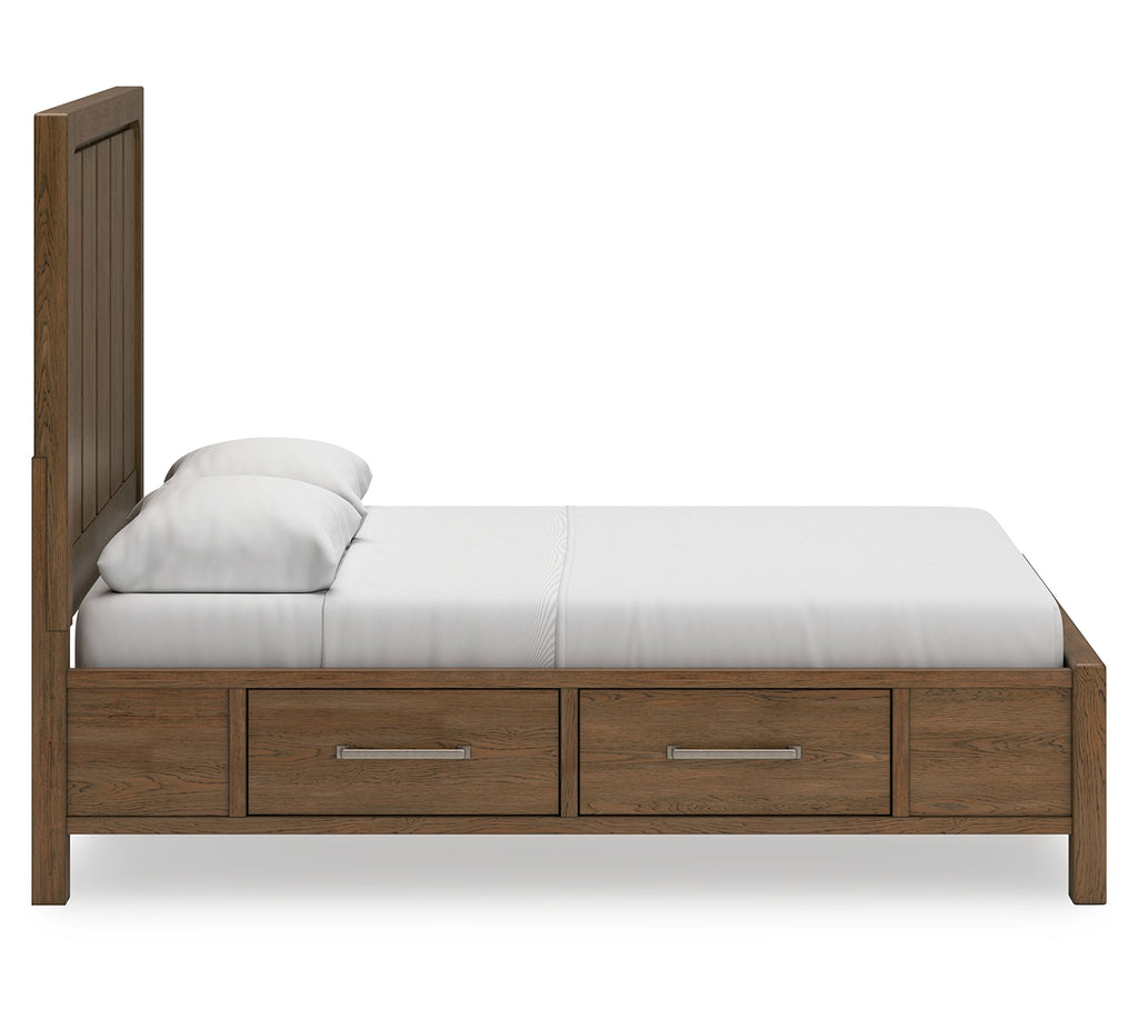 This queen panel bed with storage sits comfortably at the intersection of modern lodge and farmhouse aesthetics. Your warm and welcoming disposition is reflected in its charming architectural elements and light brown glazed finish. Even with its poise, the bed remains practical. Storage drawers are effective space-savers, defining your bedroom with reliable function and style. | Product Features