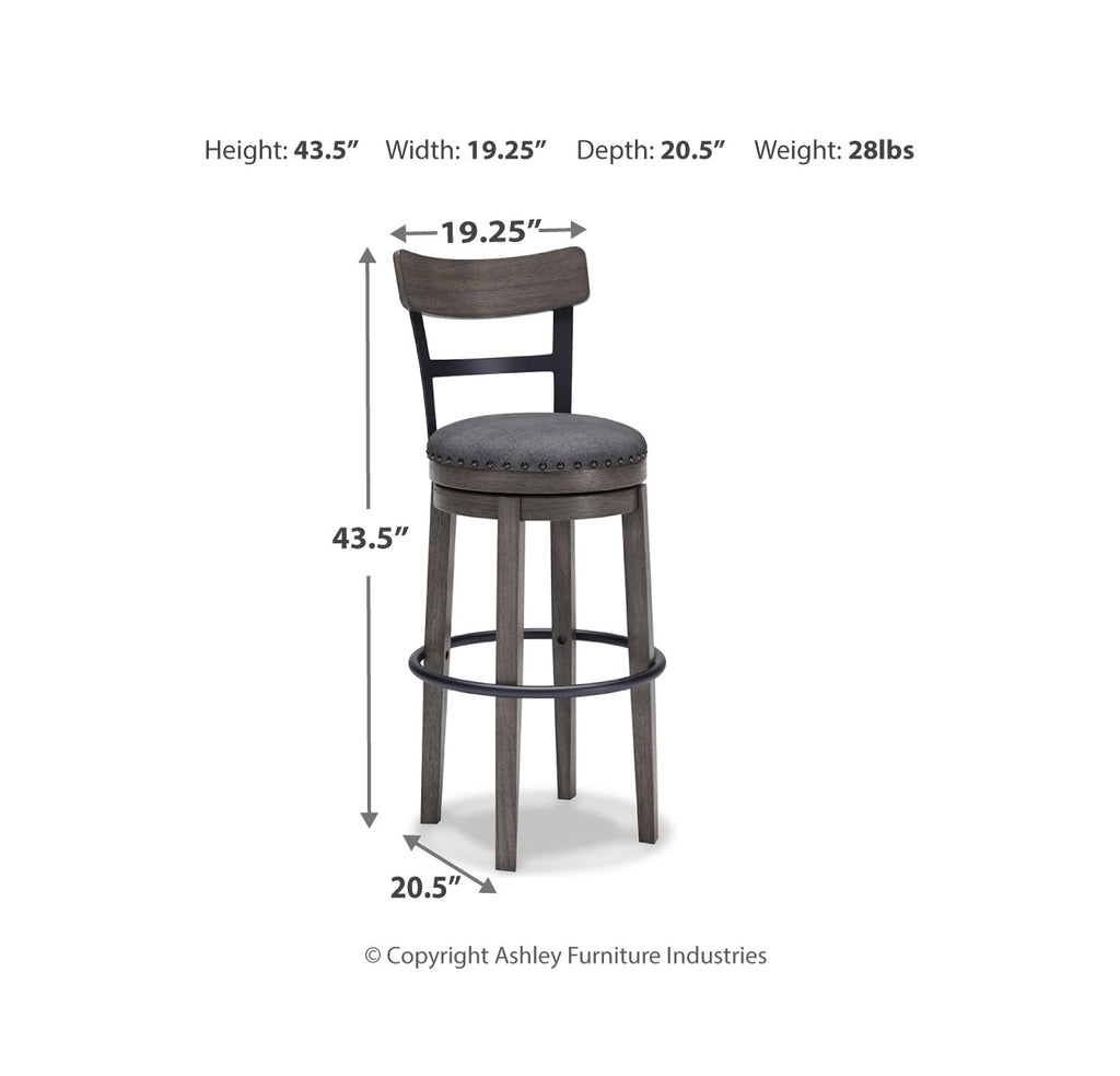 Bring a relaxed yet refined sense of good taste to a space with this upholstered swivel bar stool. The sturdy wood frame with contoured backrest is beautified with an antiqued gray wash finish that’s easy on the eyes. Rest assured, this bar stool caters to your comfort with a cushioned seat with gray textured fabric accentuated with nailhead trim. Sensible swivel design keeps you in the flow of conversation. | Product Features