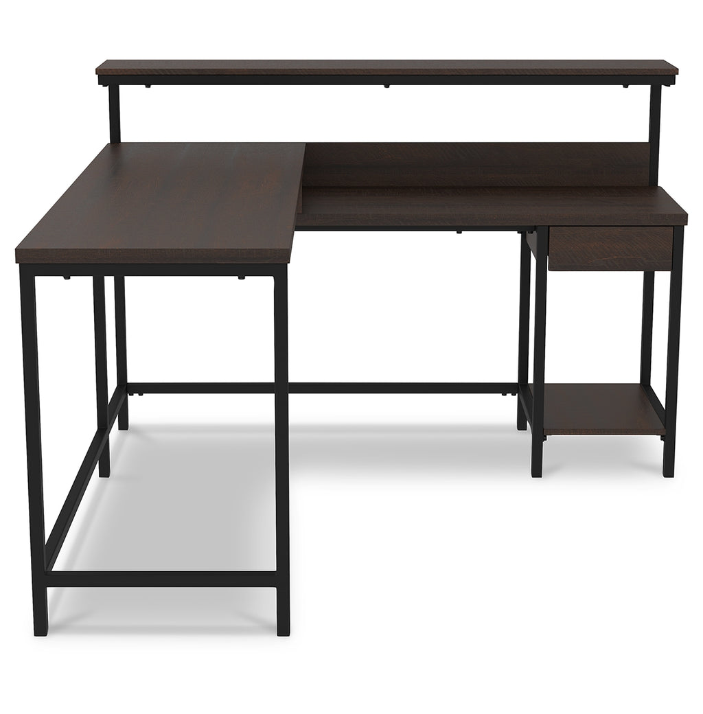 - L-desk includes desk with drawer and shelf, hutch with display shelf and return