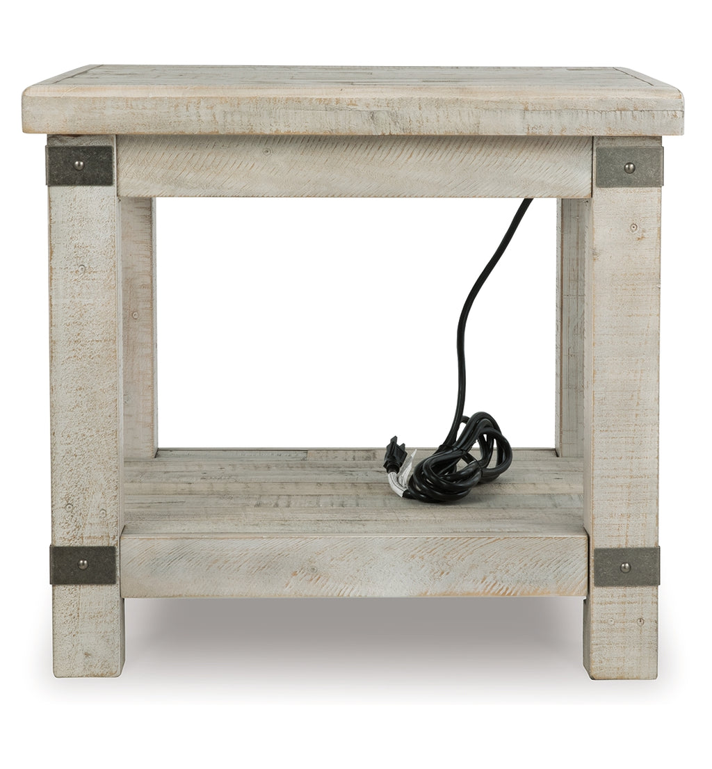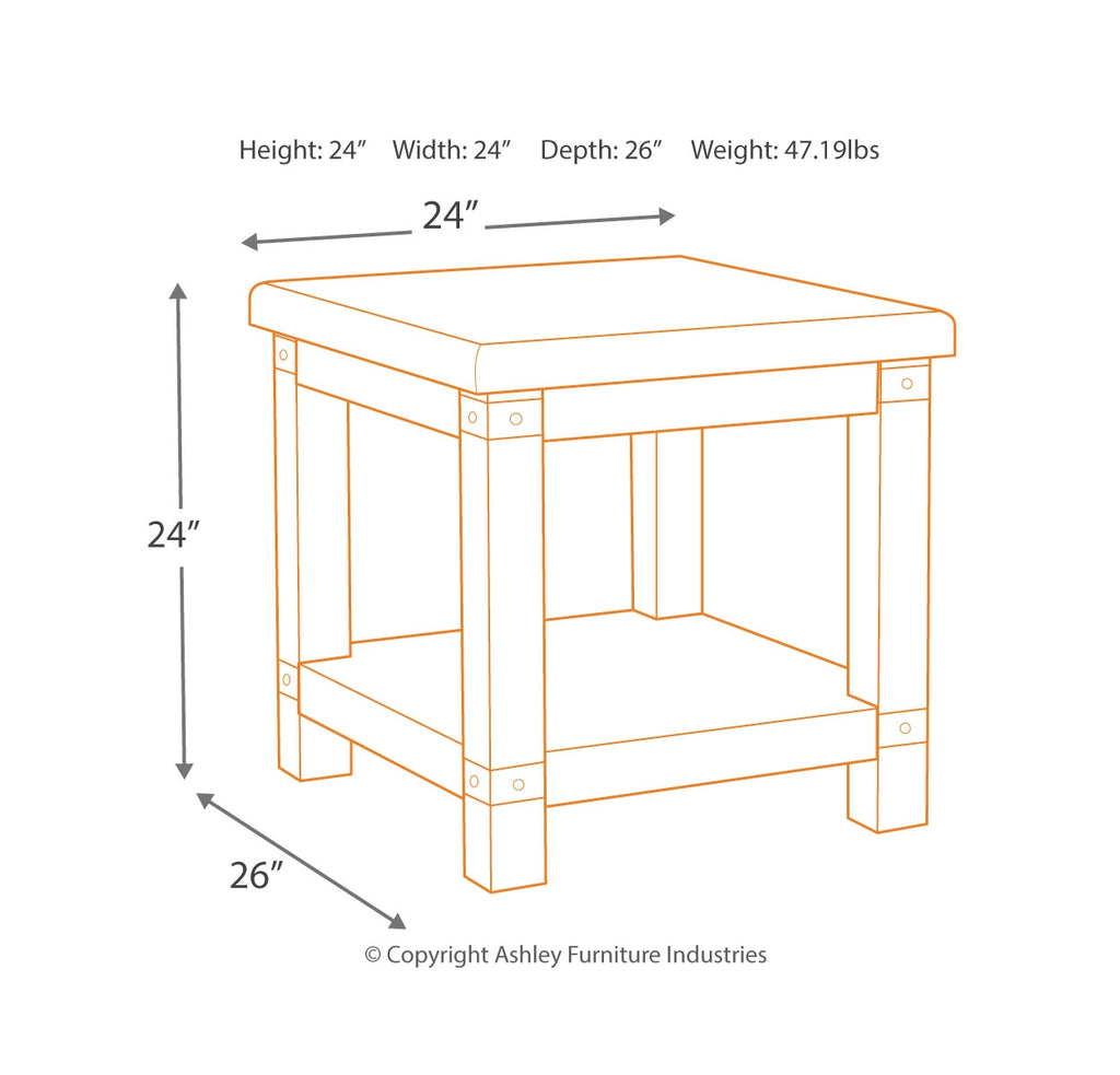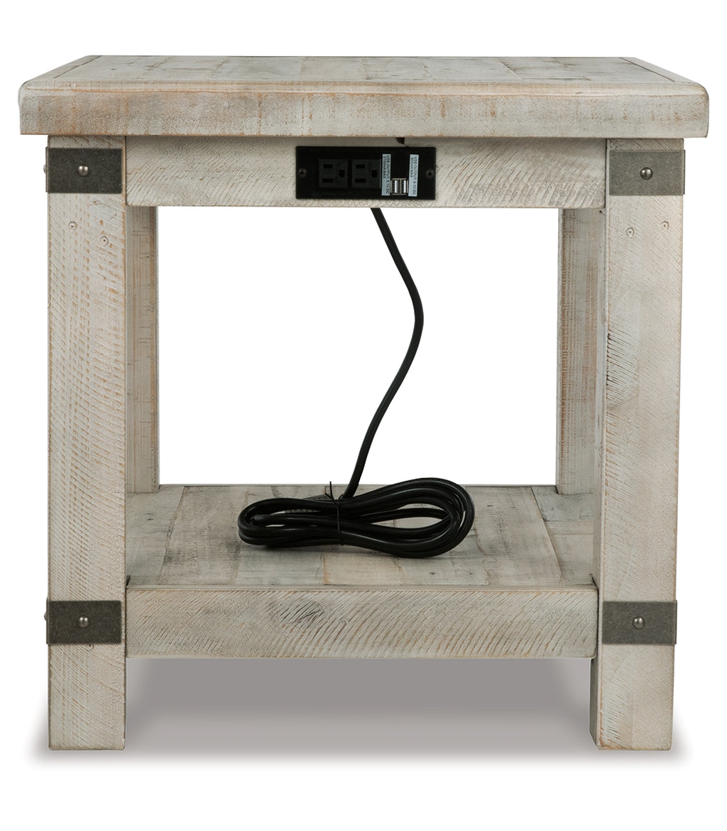 Add a quaint touch of farmhouse style to your living area with this end table. Its beautifully distressed light gray finish enhances the reclaimed wood's natural grain, which delivers a naturally aged feel straight from the countryside. You'll love its generous scale, offering a roomy table top and base shelf that are ideal for displaying accents and more. Large legs, metal accents and the planked effect dress up its country charm.