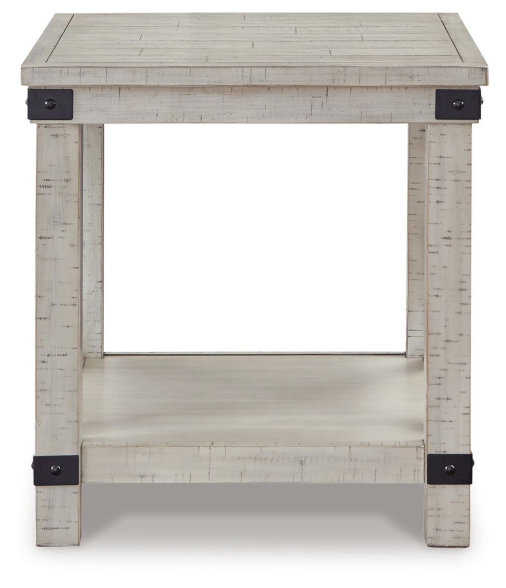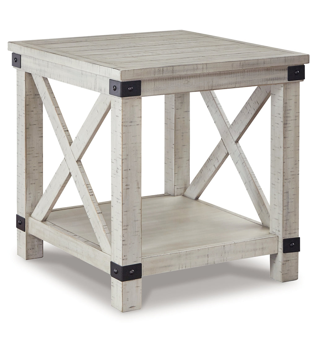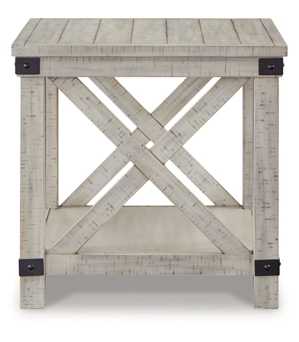 Sporting a distressed whitewash finish, this end table is rustic farmhouse living at its best. Crossbuck styling adds striking flair. Metal industrial brackets incorporate an industrial twist. | Product Features