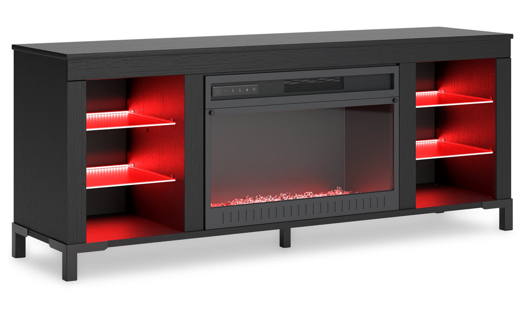 Level up your gaming experience and make movie nights to remember. This TV stand with electric fireplace extends your entertainment beyond the screen. Its built-in fireplace brings the heat, synchronizing with LED backlighting on the shelves. And you can customize the vibe with three trendy color options: blue, white and red. Modern function. Captivating, cool style. With this TV stand, revamp your home’s recreational hub like never before. | Product Features