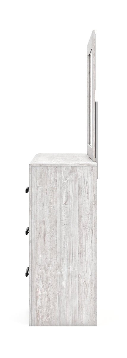 Charmingly designed, this dresser with mirror embraces the aesthetics of countryside living and repurposes them for modern settings. Its whitewash paint, replicating the wear and tear of time, appeals to your love of vintage character. A fresh take on function, the smooth-gliding drawers are a chic storage spot for your clothes and linens. | Product Features