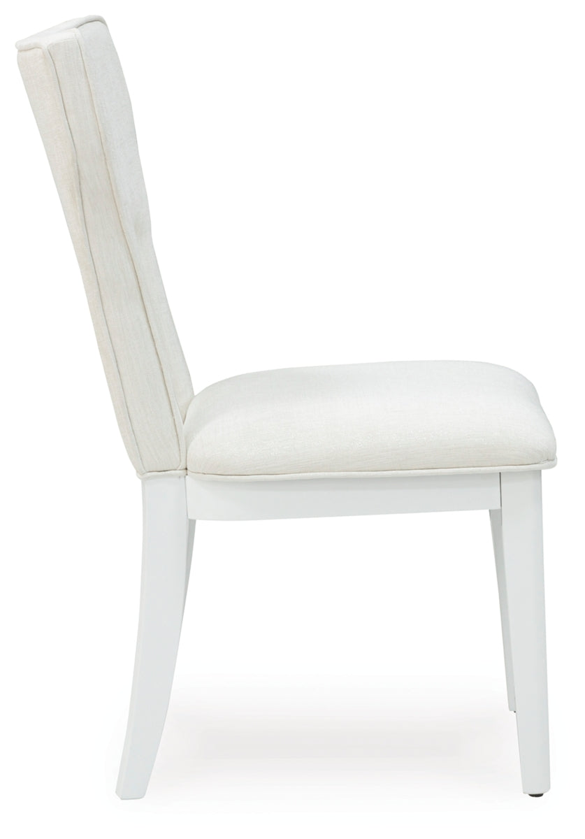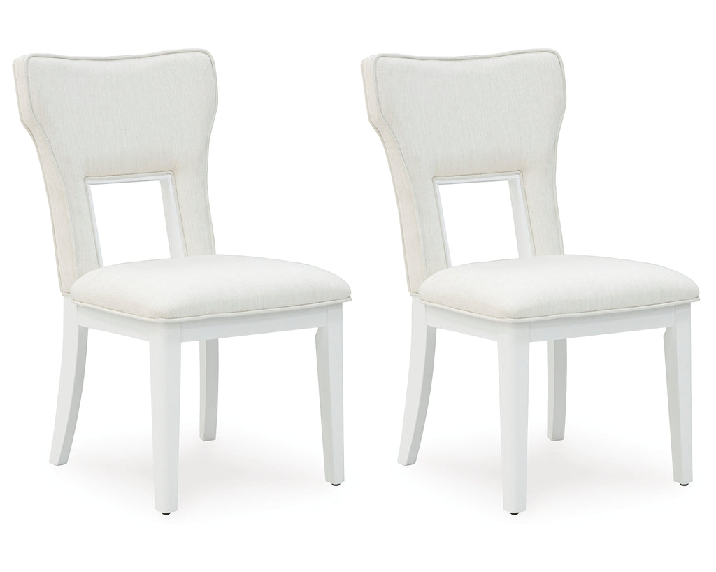 Embracing modern glamour, this dining chair is a dazzling addition to your dining area. A bright white lacquer finish and a contemporary cutout design give it a look all its own. The sumptuous upholstery wows with metallic thread accents. | Product Features