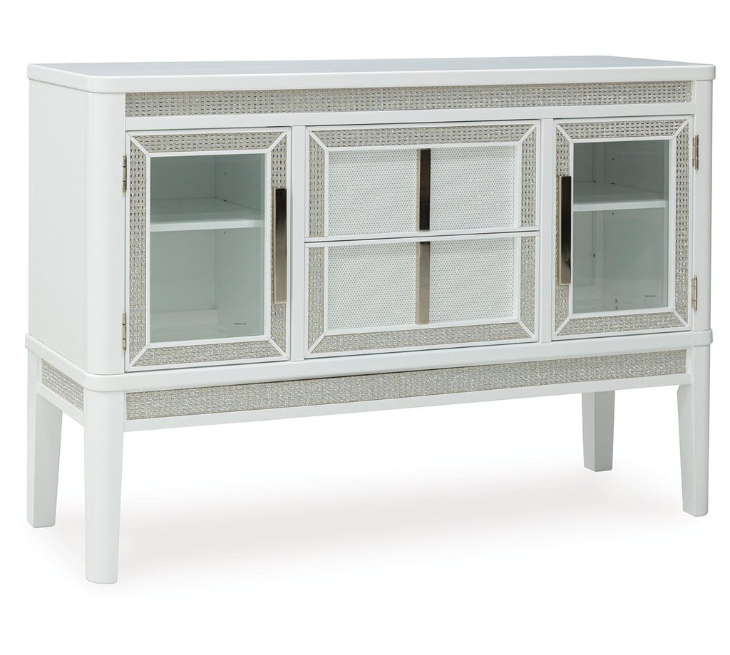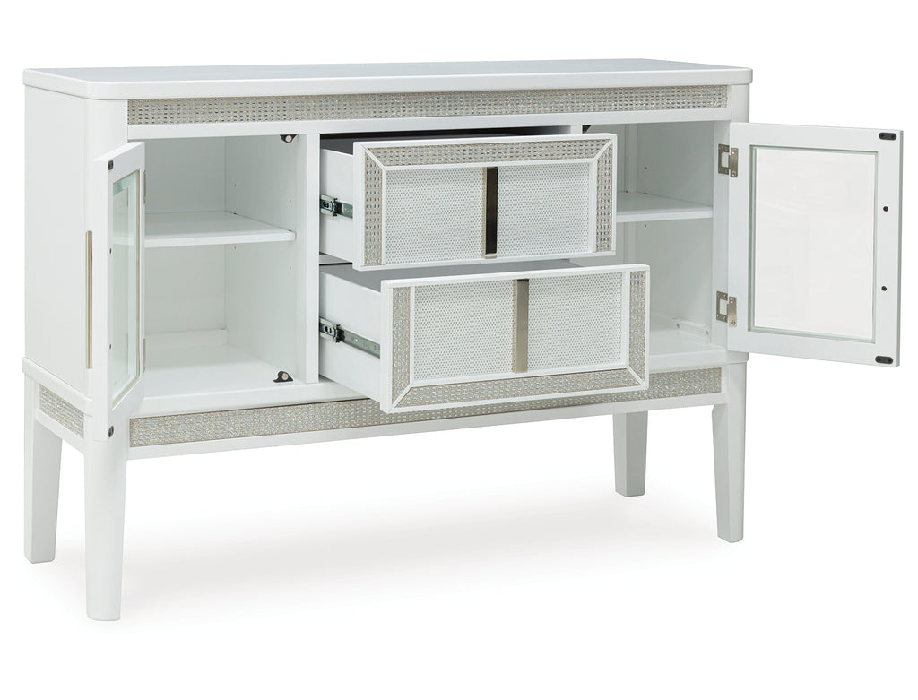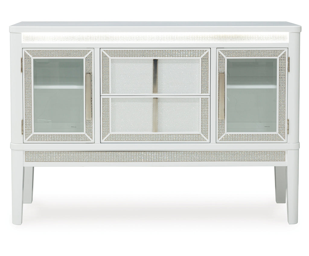 Embracing modern glamour, this server is a sparkling addition to your dining area. The bright white lacquer finish, shimmering rhinestone accents and glass panel doors give this piece plenty of polish. Discreetly placed along the upper valance, white LED lighting adds the perfect finishing touch. | Product Features