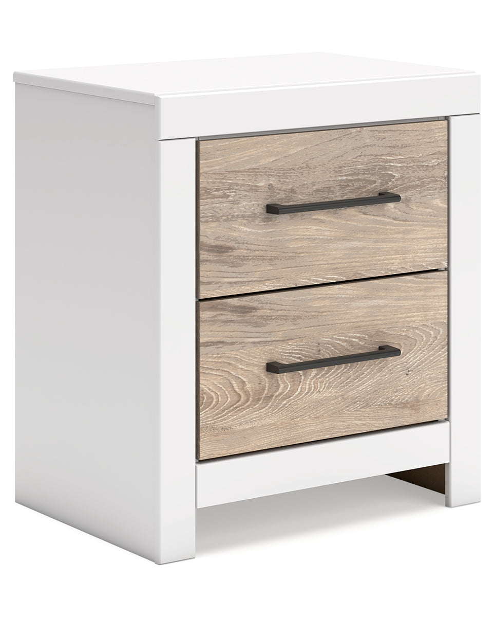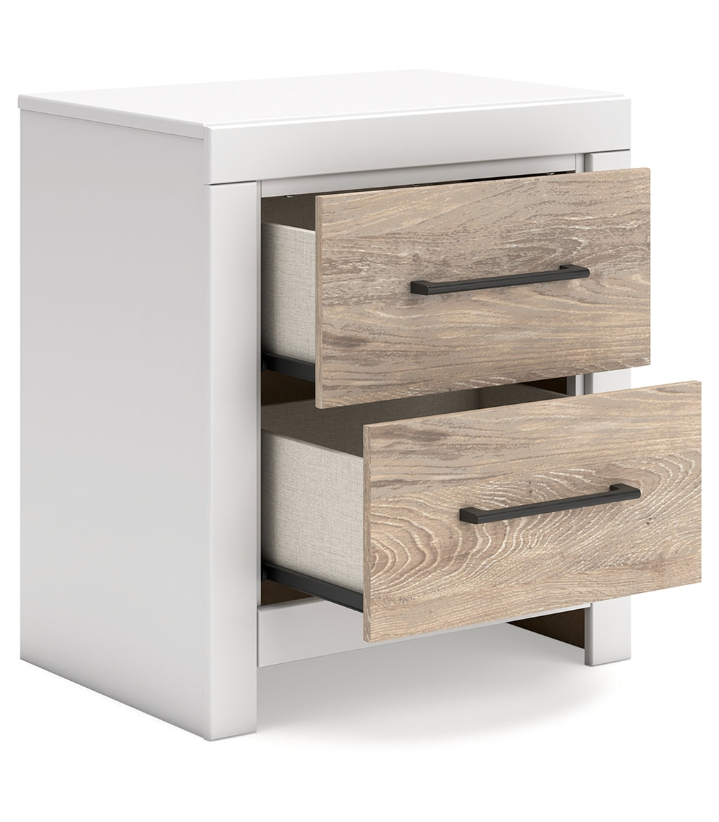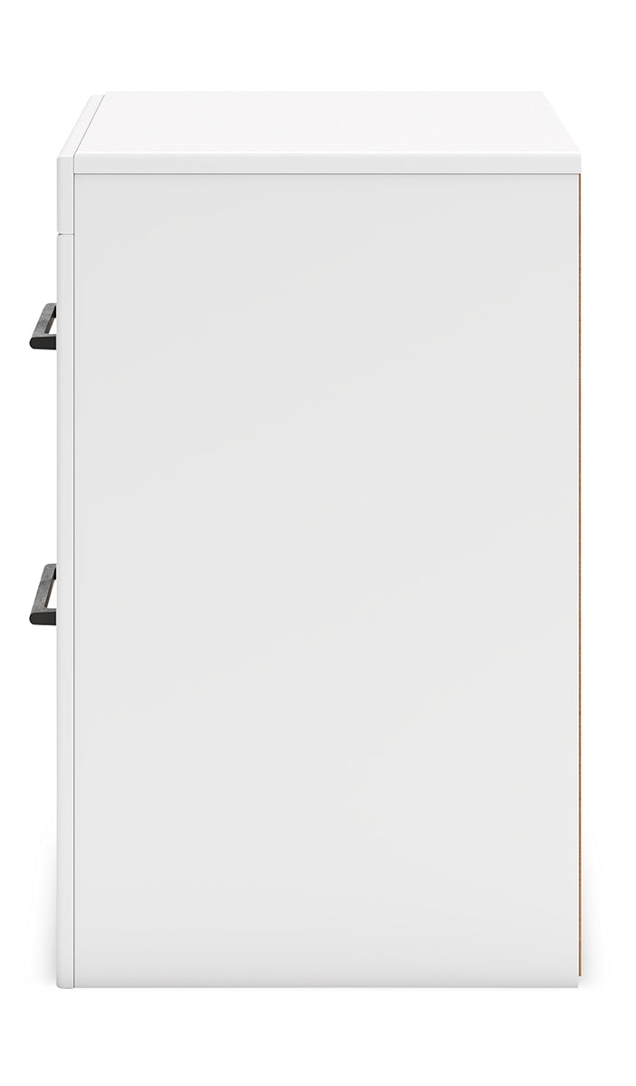 Relaxed yet striking, this nightstand brings casual beauty and function to your dream destination. A delightful two-tone treatment blends a fresh replicated oak grain with a matte white finish, while sleek handles in an antiqued gunmetal finish lend a contemporary touch. You're sure to love its spacious drawers that glide open and offer plenty of storage for nighttime essentials. Conveniently charge your devices using the USB charging ports on the back. | Product Features