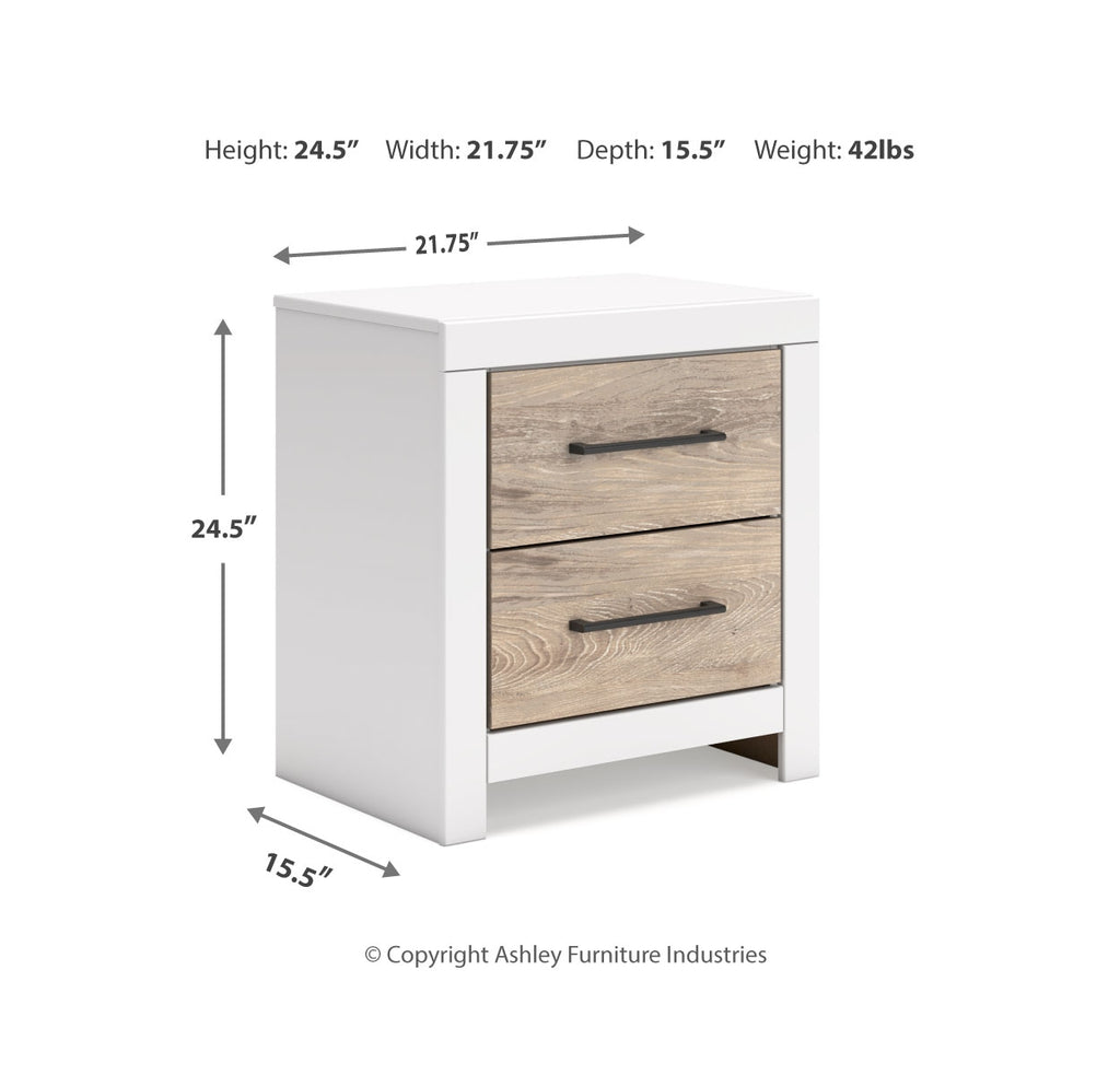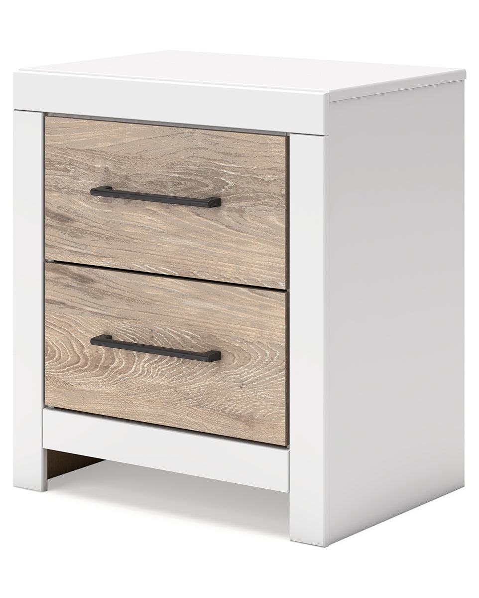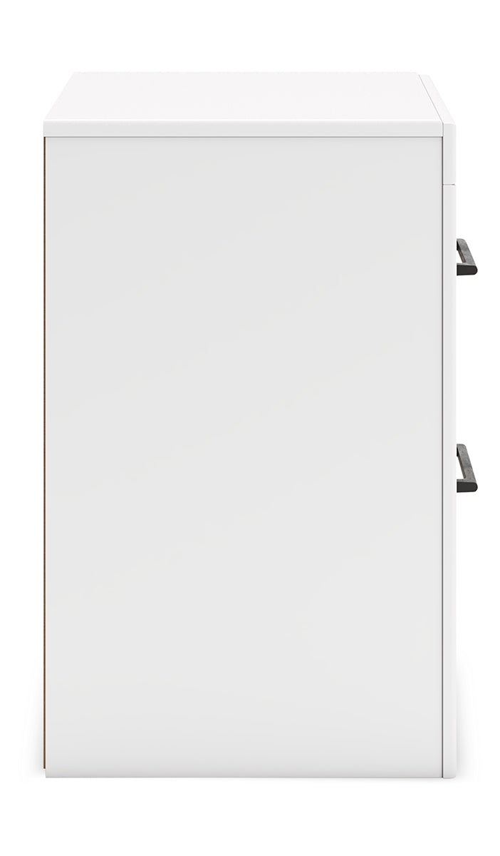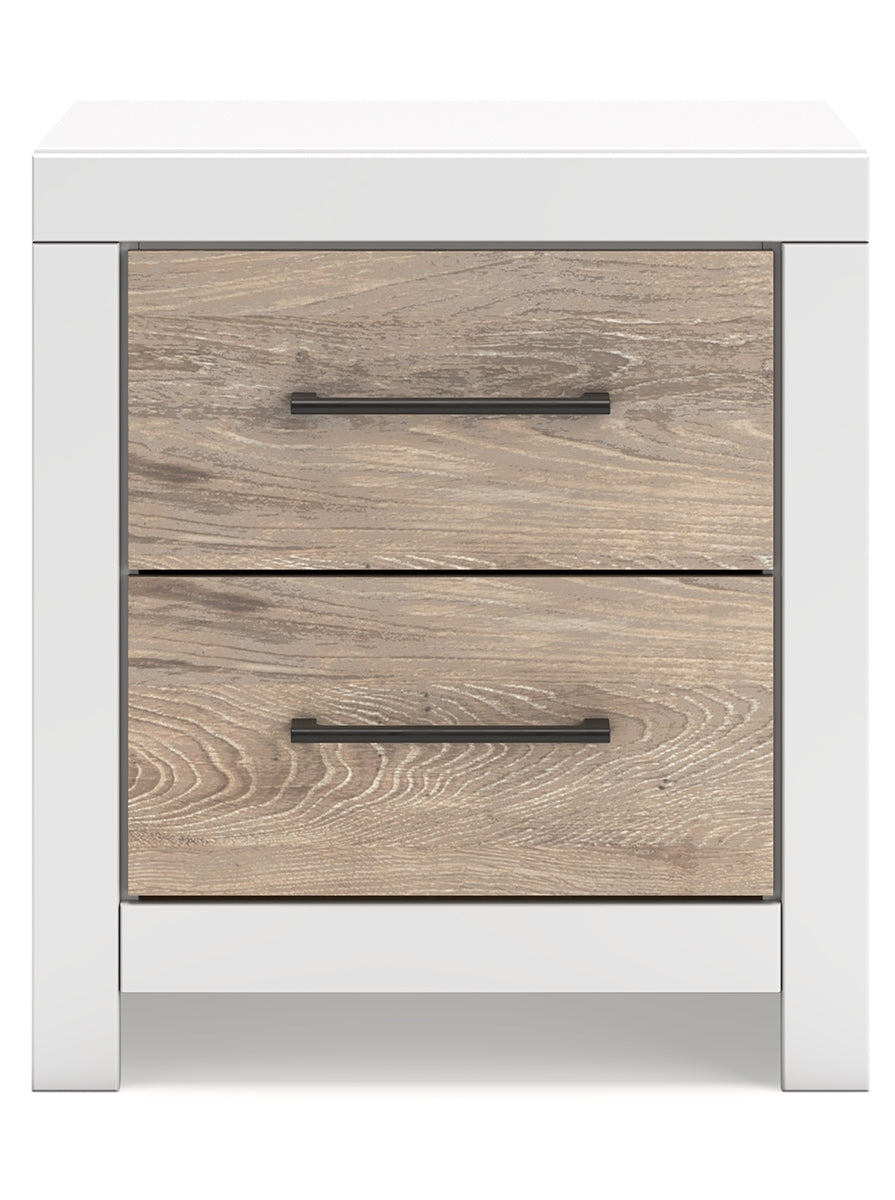 Relaxed yet striking, this nightstand brings casual beauty and function to your dream destination. A delightful two-tone treatment blends a fresh replicated oak grain with a matte white finish, while sleek handles in an antiqued gunmetal finish lend a contemporary touch. You're sure to love its spacious drawers that glide open and offer plenty of storage for nighttime essentials. Conveniently charge your devices using the USB charging ports on the back. | Product Features