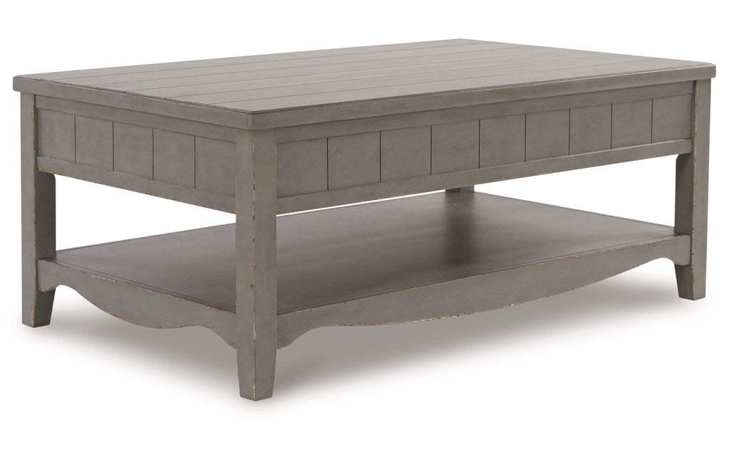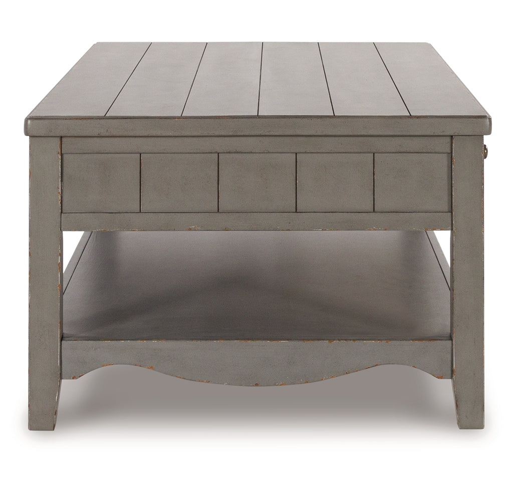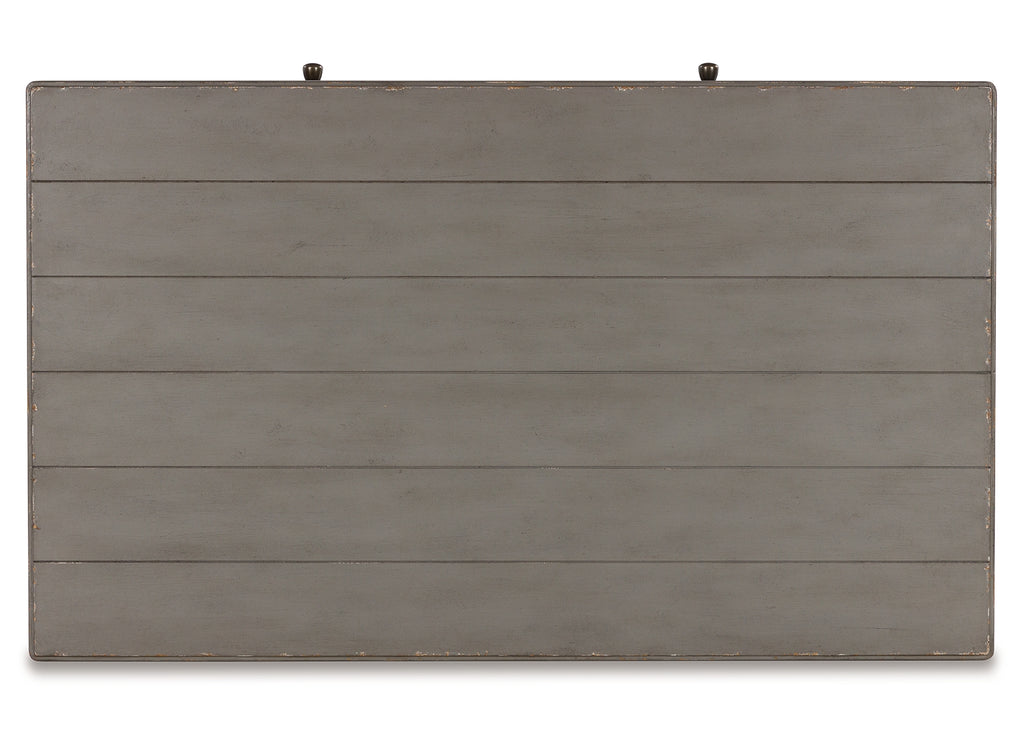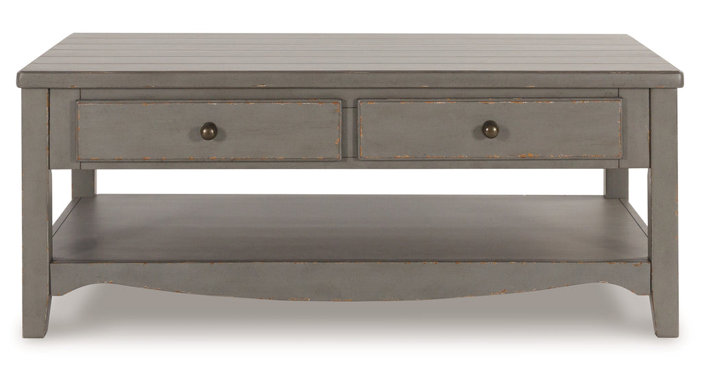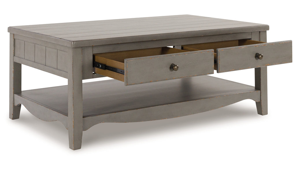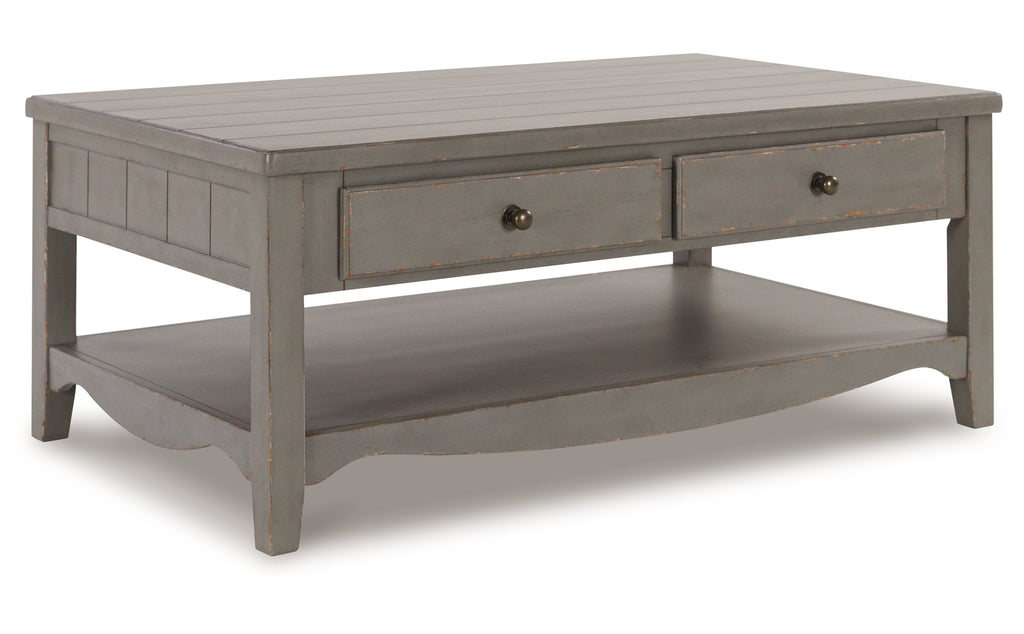 Put your love of European farmhouse styling on display. Finished with an antiqued gray chipped paint effect for an authentic vintage look, this coffee table is loaded with character. Two drawers and an open display shelf allow for storage and easy access to books, beverages and more. | Product Features