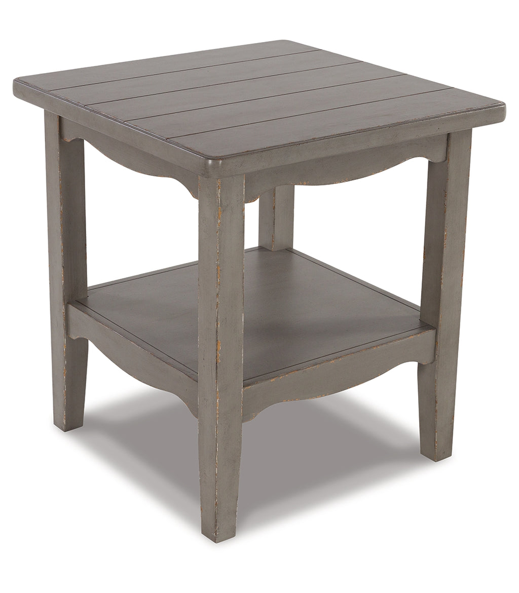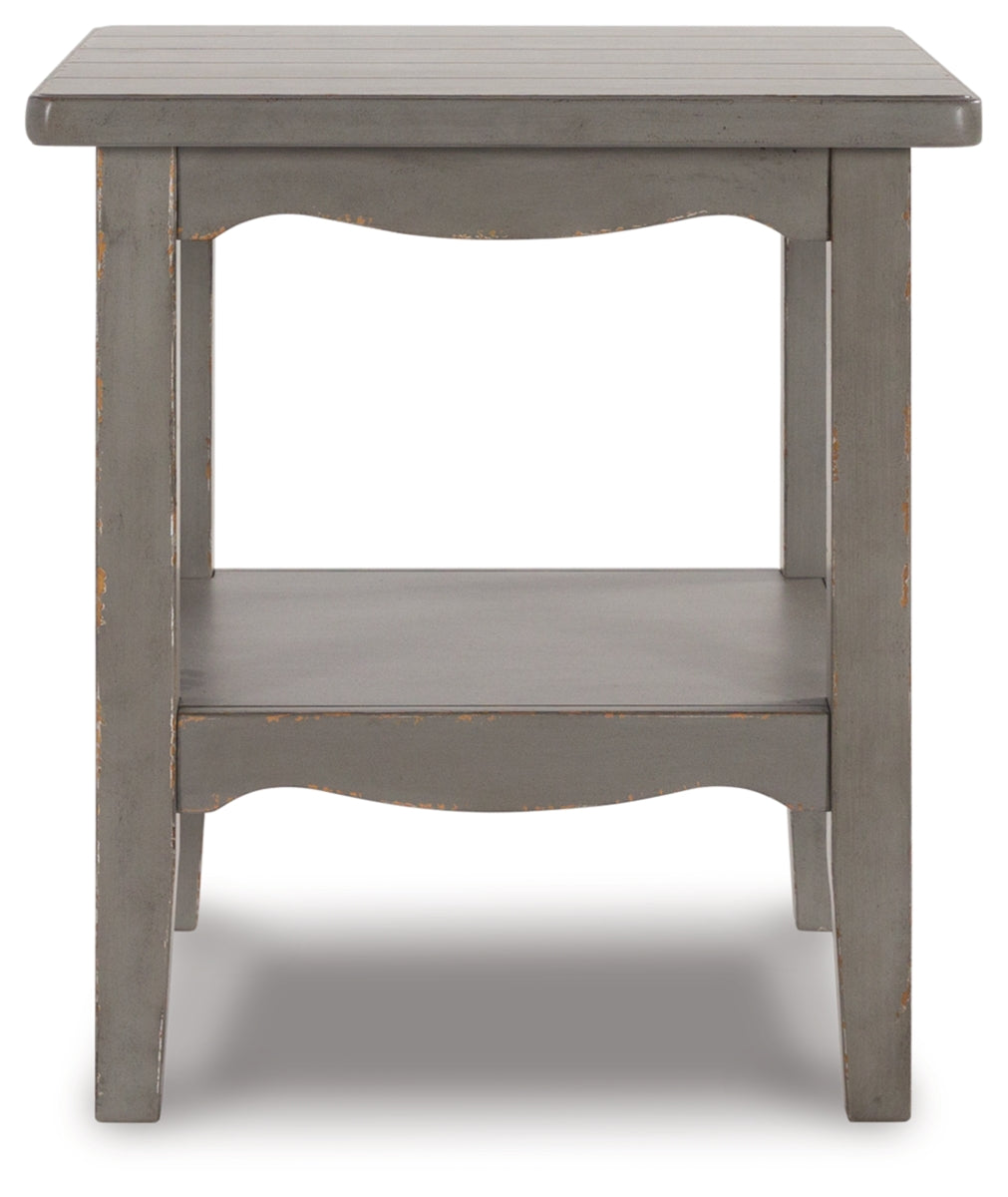 Put your love of European farmhouse styling on display. Finished with an antiqued gray chipped paint effect for an authentic vintage look, this end table is loaded with character. An open display shelf allows for storage and easy access to books, beverages and more. | Product Features