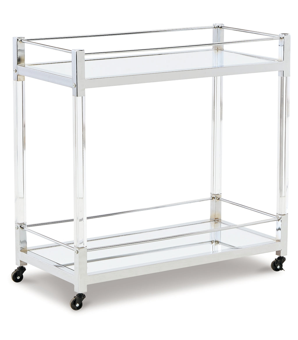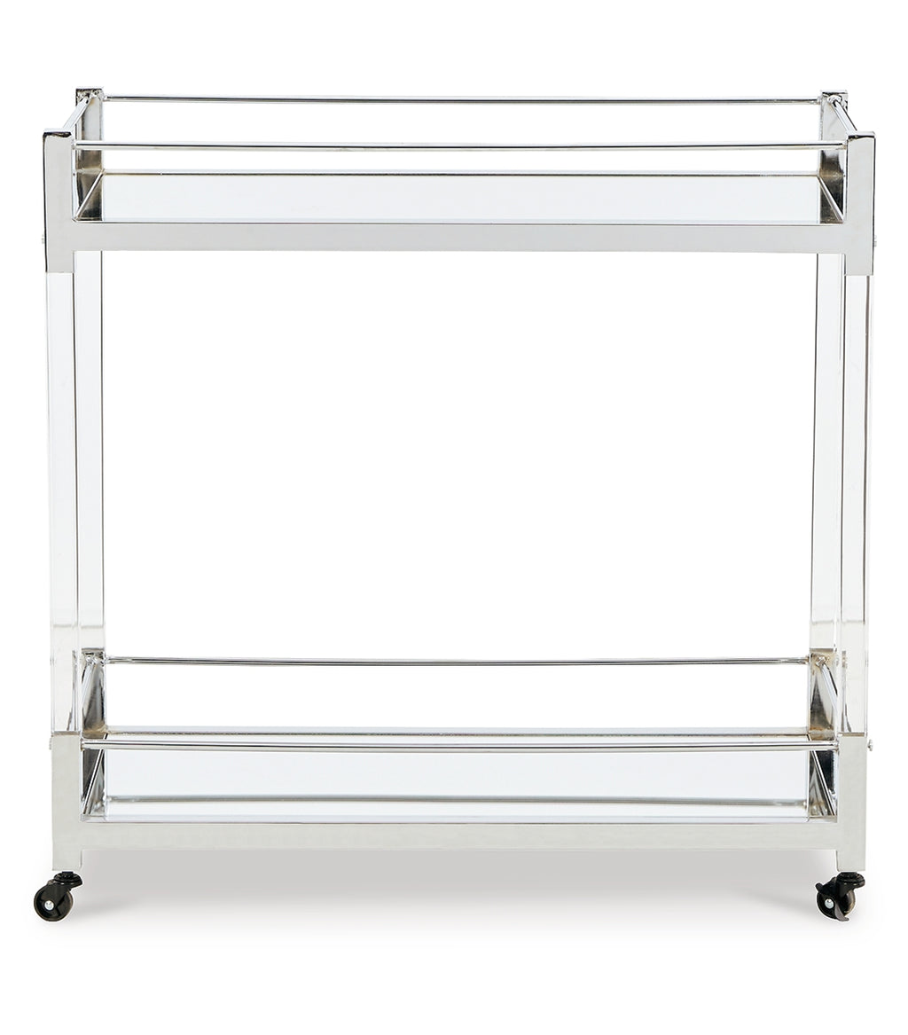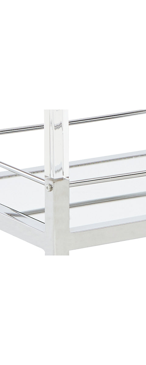 Reflect your love for contemporary style with this bar cart. With two shelves made with mirrored glass, it adds both light and a touch of glam to your space. A clear acrylic and chrome-tone frame is a modern take on understated elegance. And thanks to rolling casters, serving your guests has never been easier. | Product Features