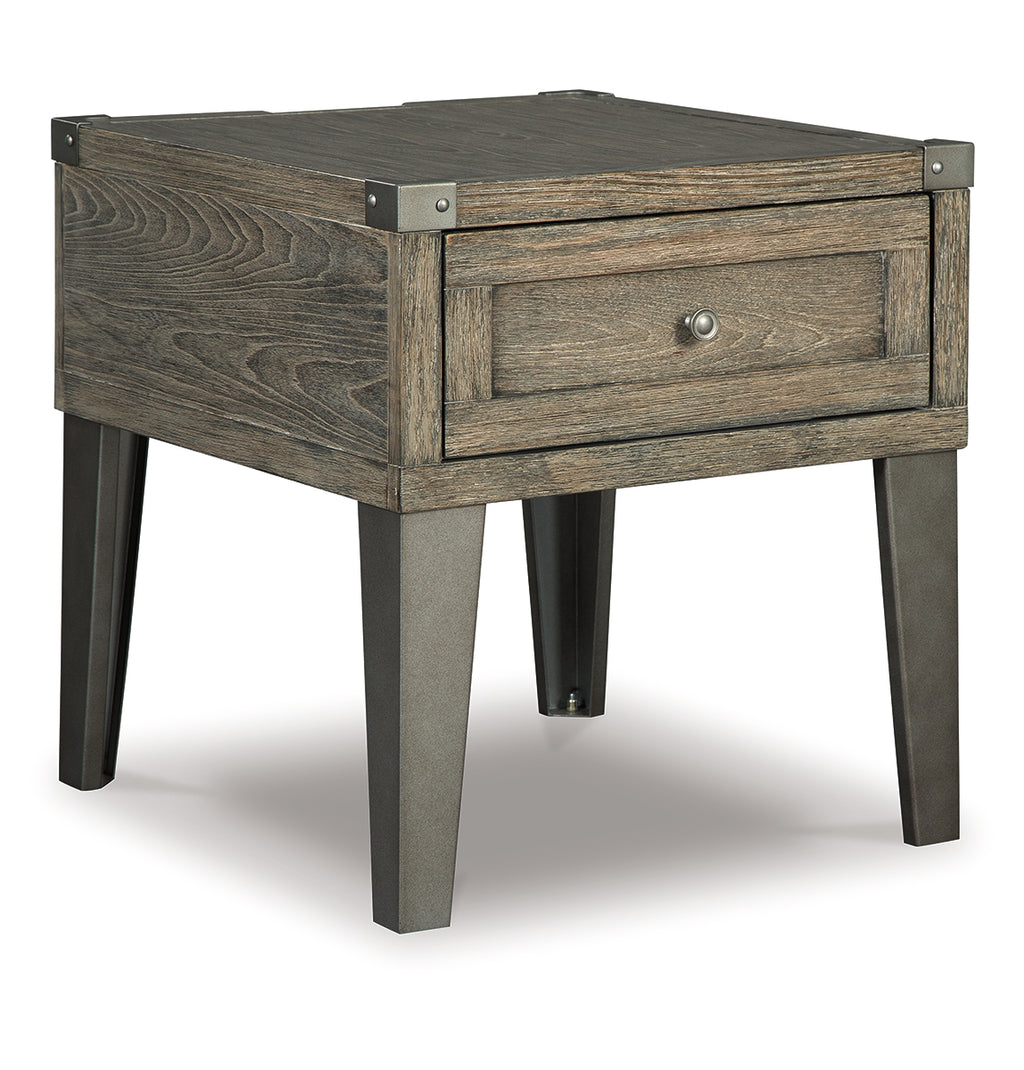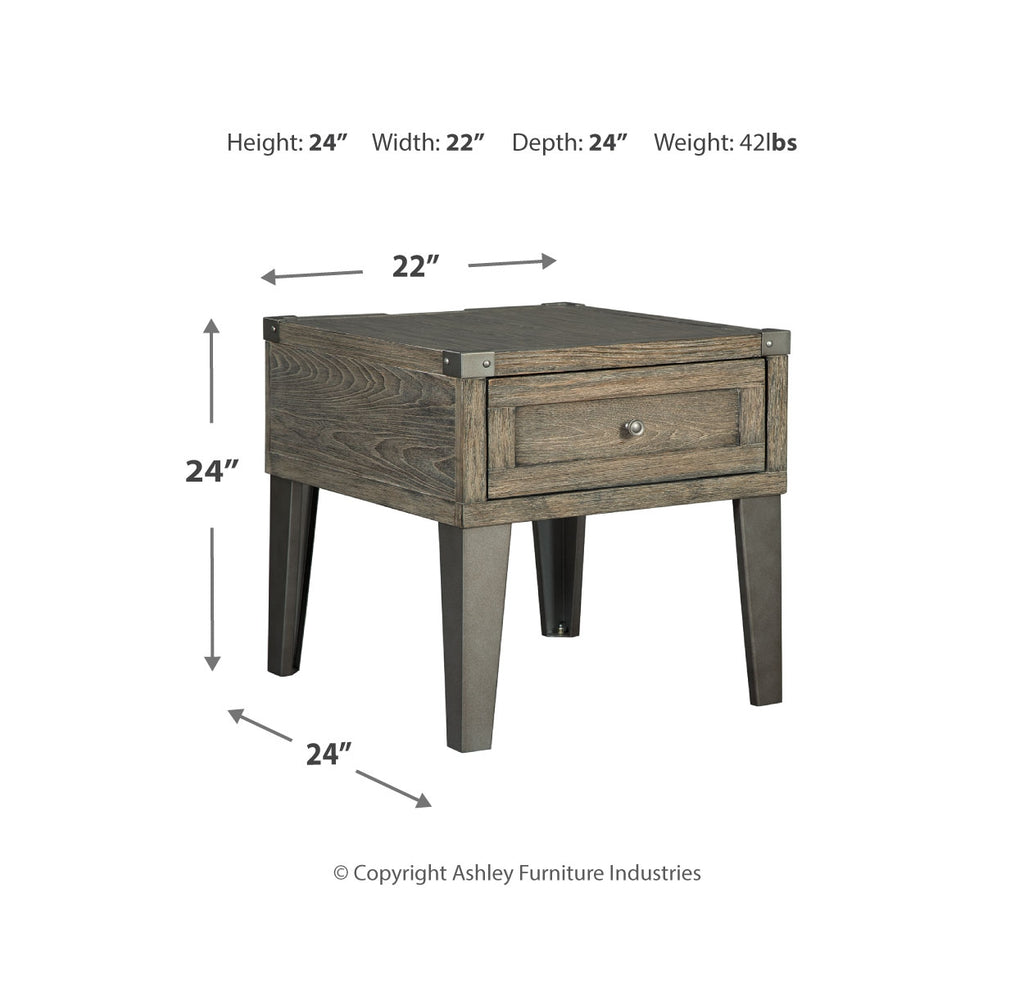 Celebrating the lighter side of modern industrial style, this end table is the best in form meets function. The table’s less-is-more weathered finish allows the natural wood grain to take center stage. Metal bracket accents and tapered metal legs in a silvertone finish are a cool yet refined touch. A smooth-gliding drawer offers plenty of handy storage. | Product Features