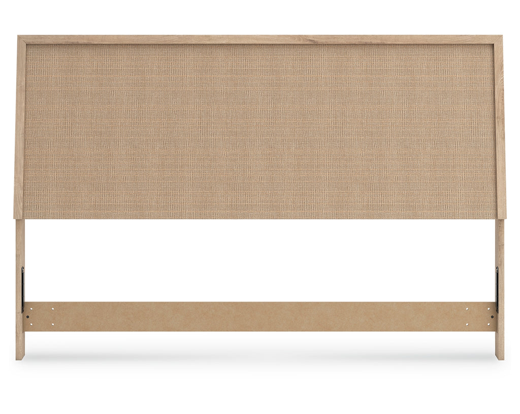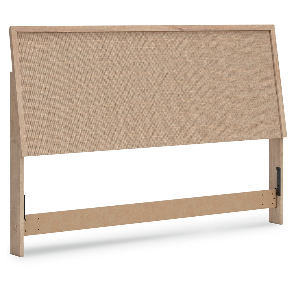 Clean-lined and contemporary—but far from stark—this king panel headboard is a fresh style awakening. Pairing a light finish with replicated oak grain and textured beige panel that replicates the look of cane, its mixed materials bring a naturally versatile vibe to your bedroom. Talk about style with added dimension. Its simplicity plays perfectly with the modern aesthetic and is the stuff dreams are made of. | Product Features